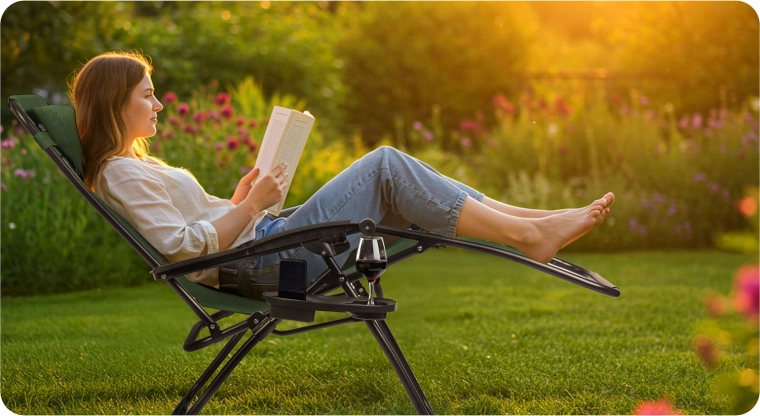 Det integrerede minibord holder drik, telefon eller bog lige ved hånden – sikkert og bekvemt under afslapningen.
