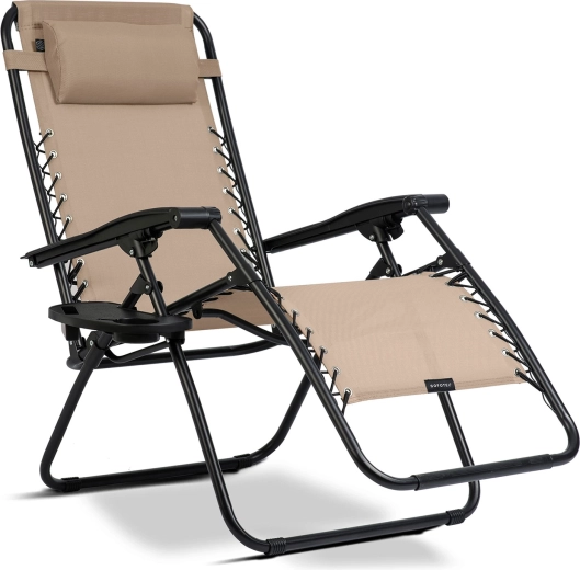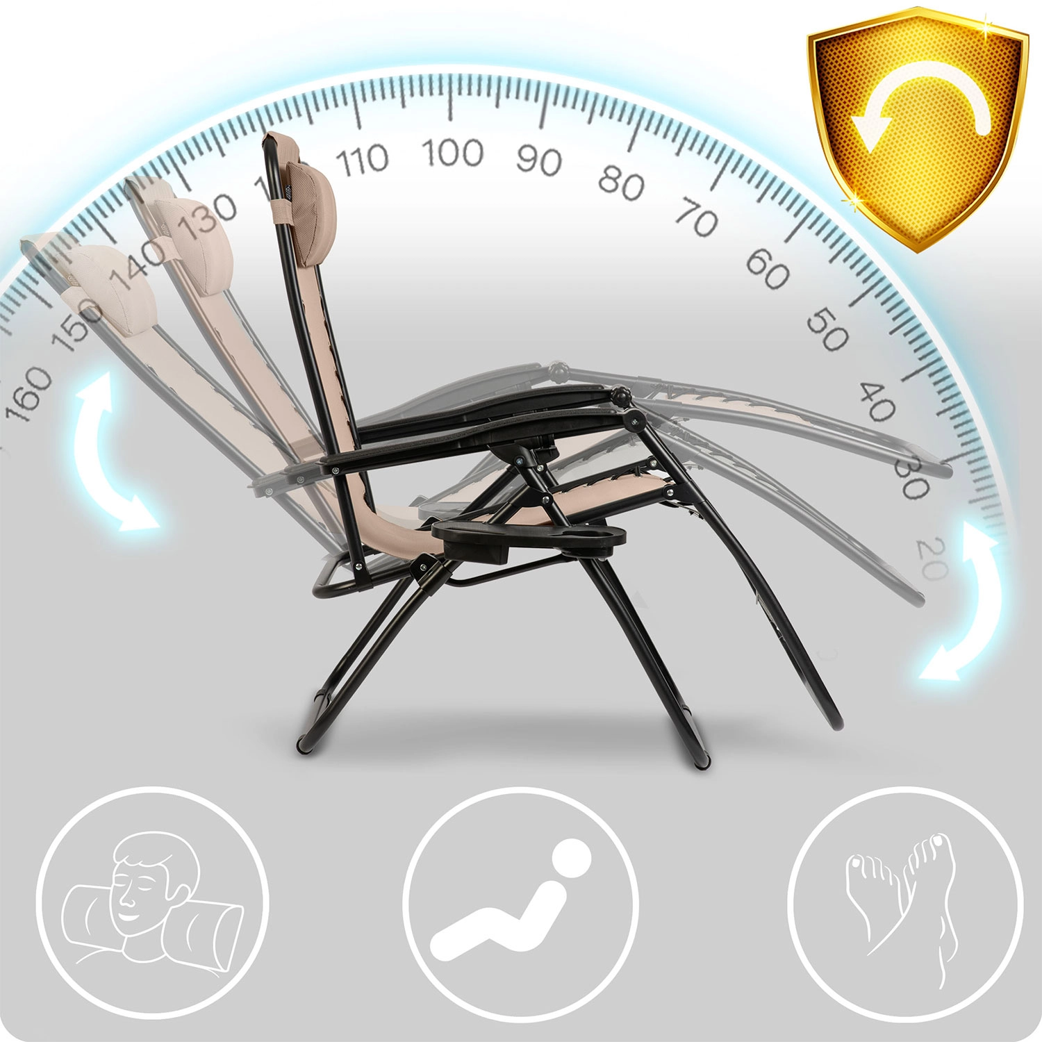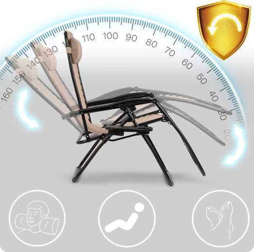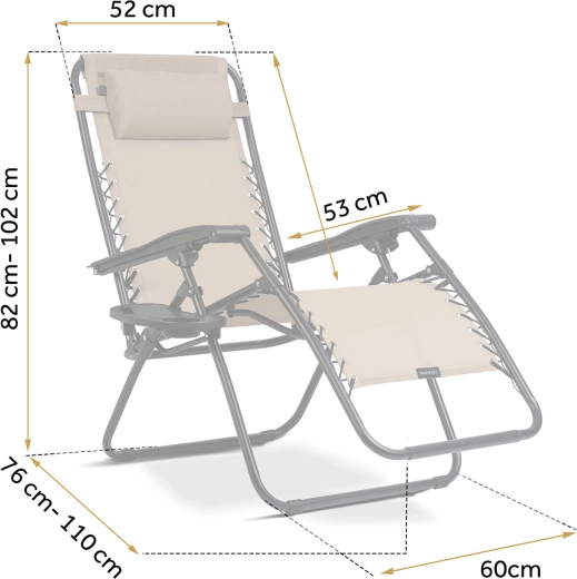 Den praktiske udrustning omfatter en aftagelig hovedpude og et sidebord med kopholdere og plads til telefon eller småting – alt er lige ved hånden. Stabil stålramme med pulverlakering og elastiske snore sikrer tryg siddende og liggende komfort op til 120 kg.