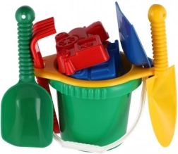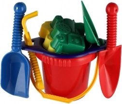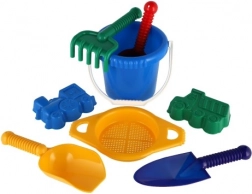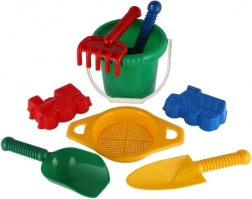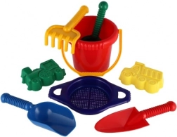 Indeholder alle nødvendige værktøjer til bygning og kreativ leg i sandet - spand, si, skovle, river og to sandforme.
