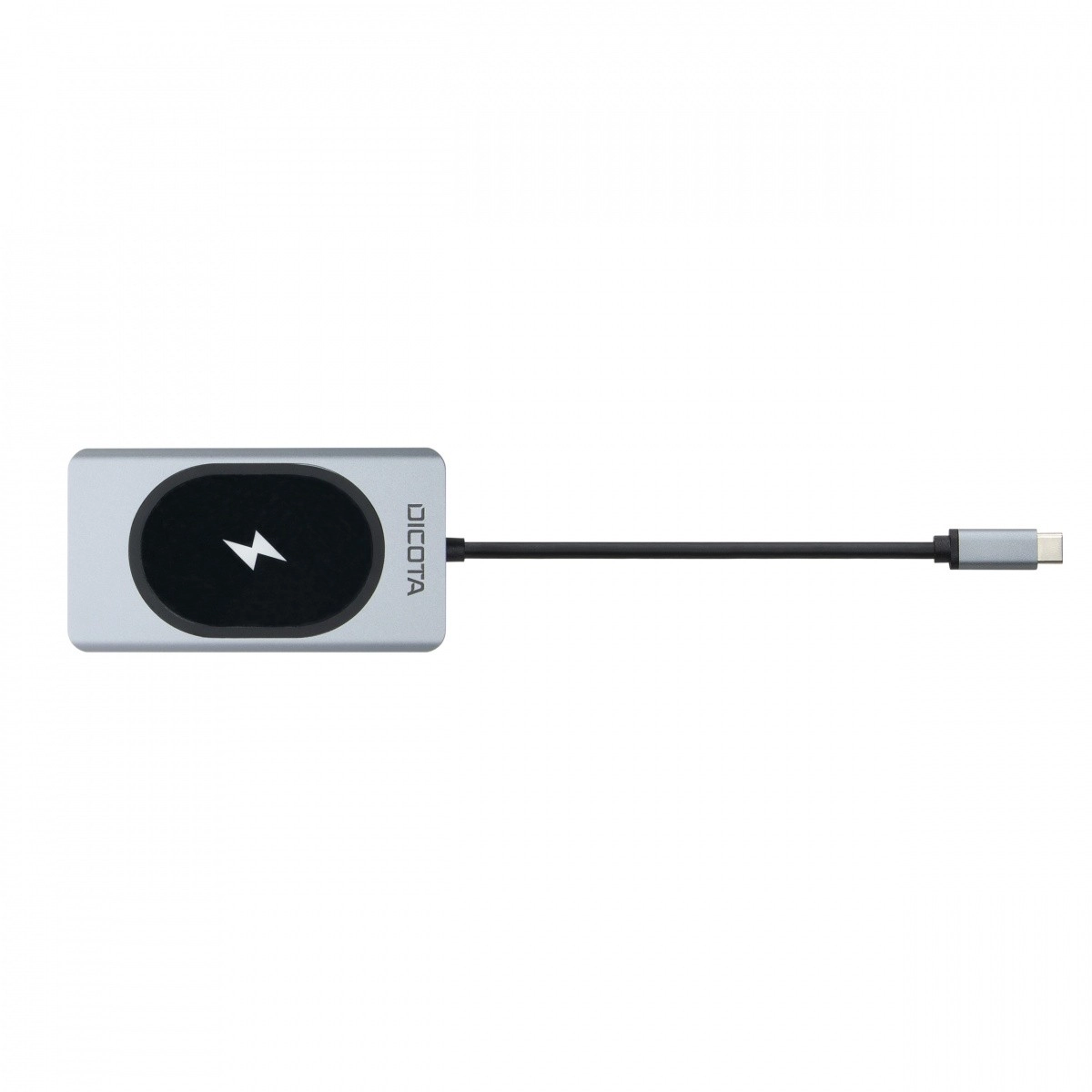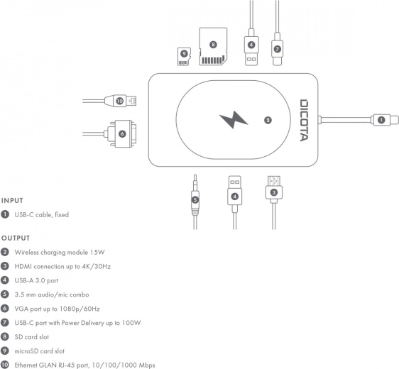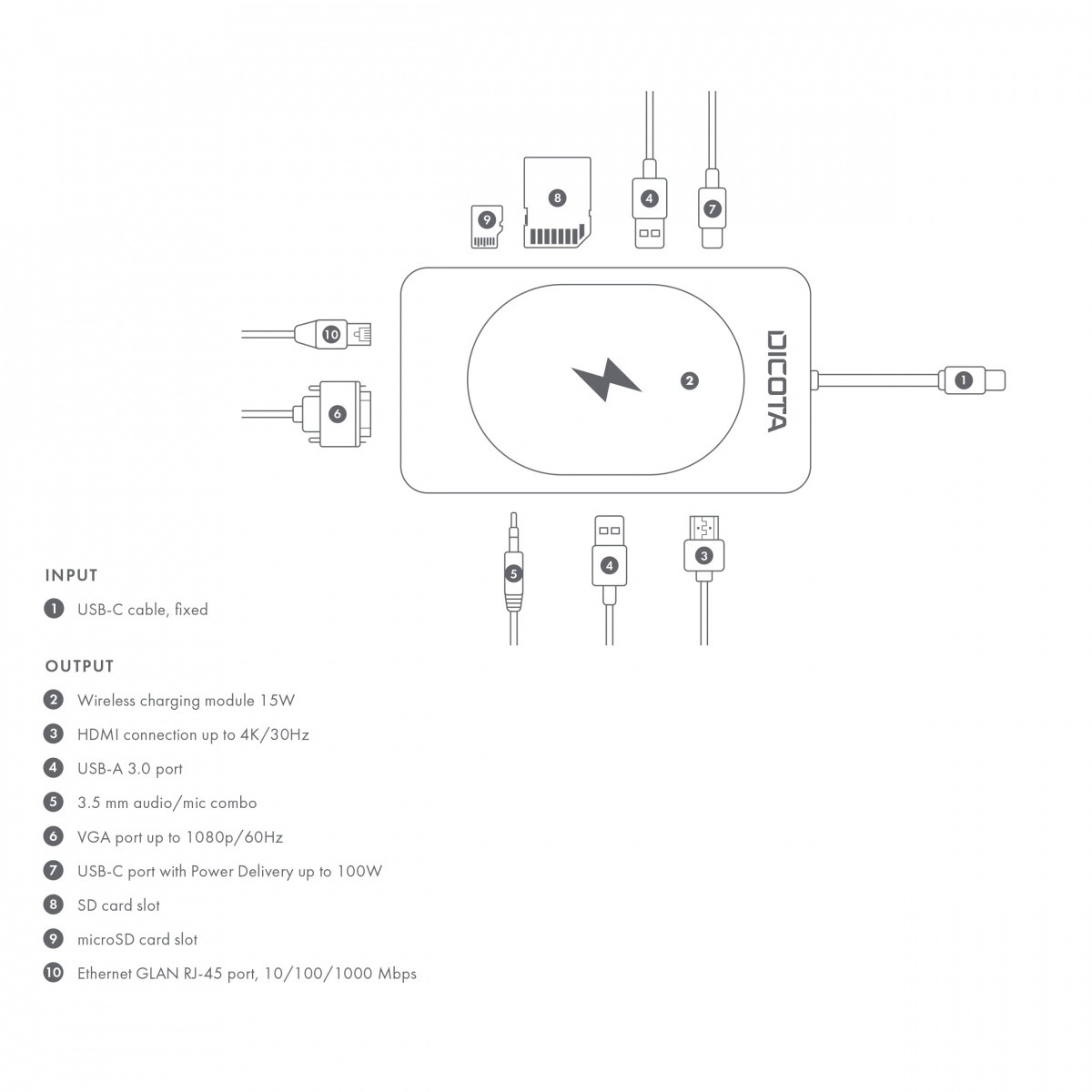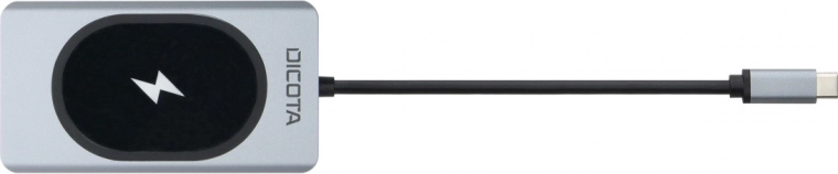 Den elegante DICOTA USB‑C hub i aluminium udvider én enkelt port på din bærbare til en fuld dockingstation. Tilslut ekstern skærm i 4K‑opløsning via HDMI eller projektor via VGA 1080p; en stabil forbindelse sikres af RJ‑45 op til 1000 Mb/s. Den integrerede plade med lynikon muliggør trådløs Qi‑opladning op til 15 W – ideelt til telefon eller hovedtelefoner.