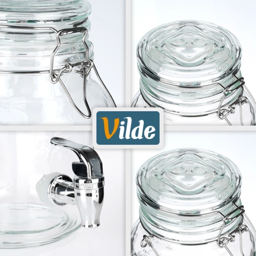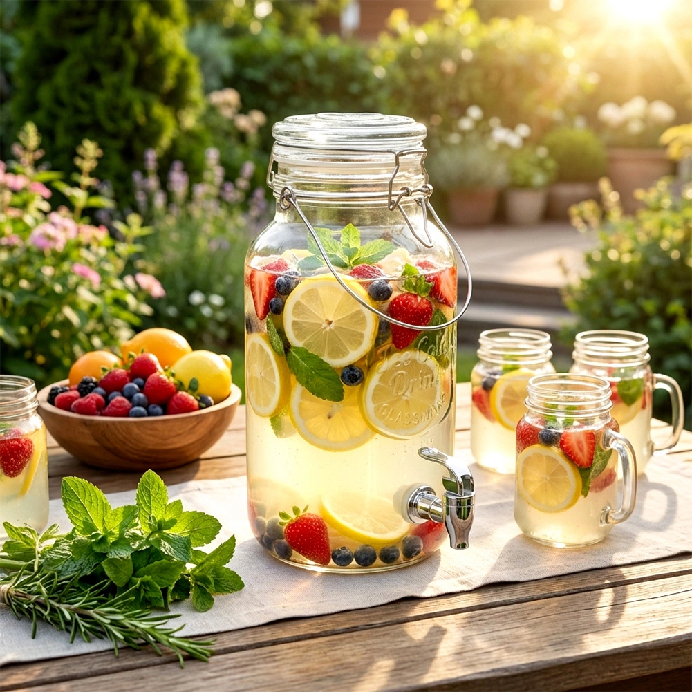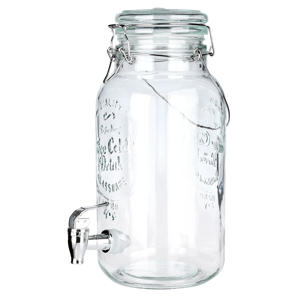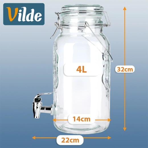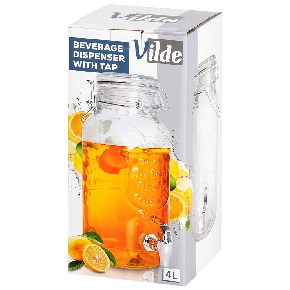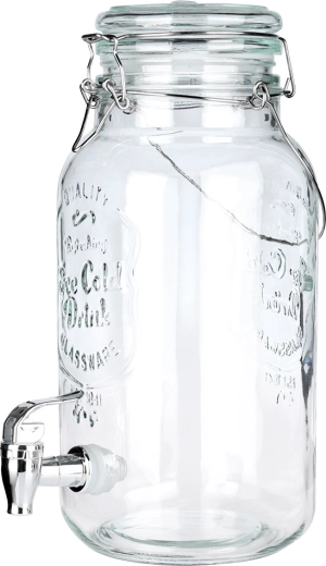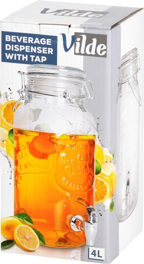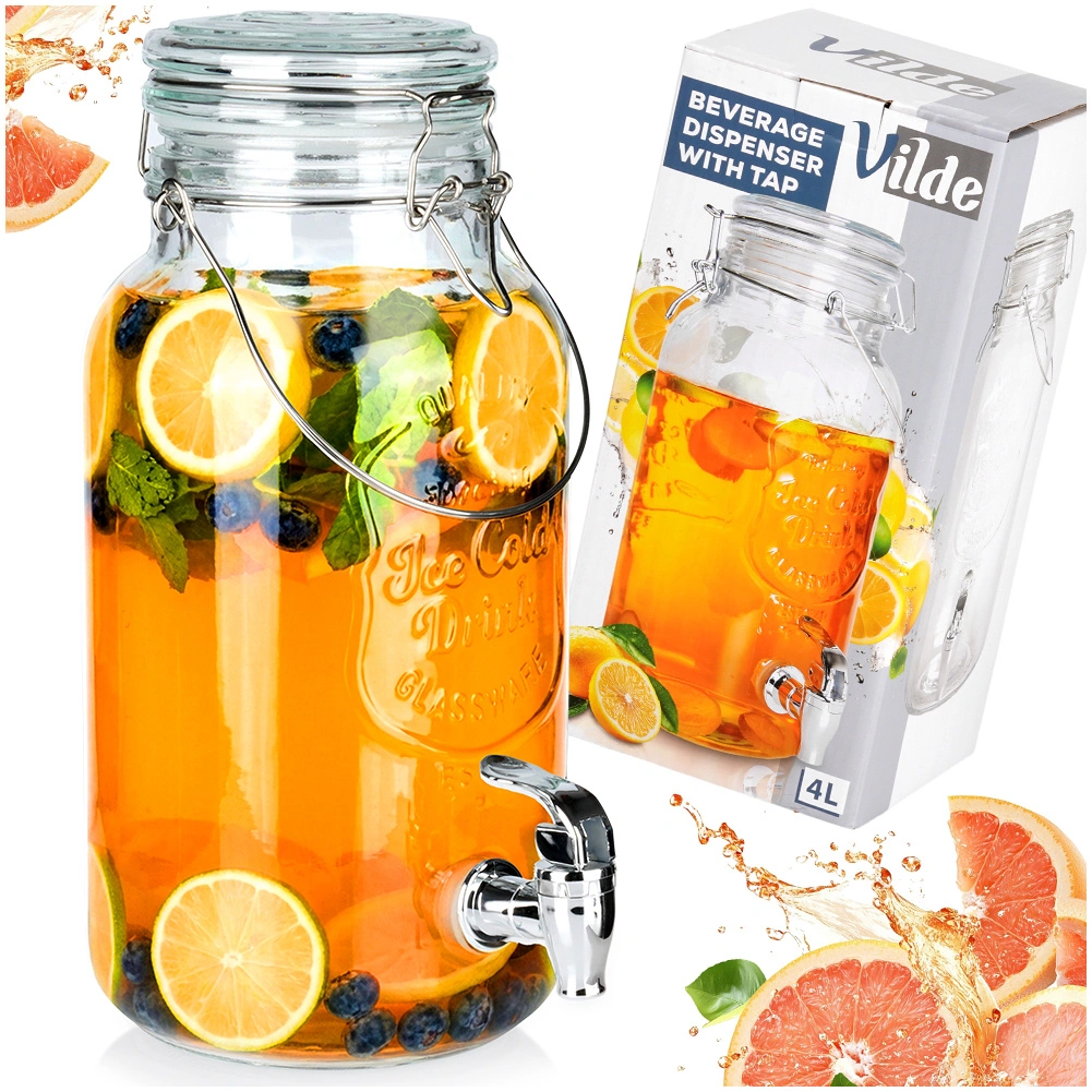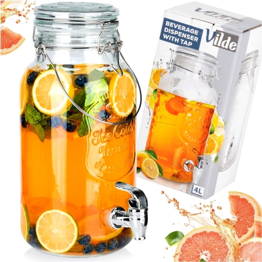 Stilfuld glastapdispenser på 4 l med metalhane og lufttæt låg, ideel til servering af limonade, vand med frugt, punch eller iste. Takket være den brede hals er den nem at fylde og rengøre, det stærke bærehåndtag gør den let at transportere, og klipslåsen beskytter drikken mod insekter.