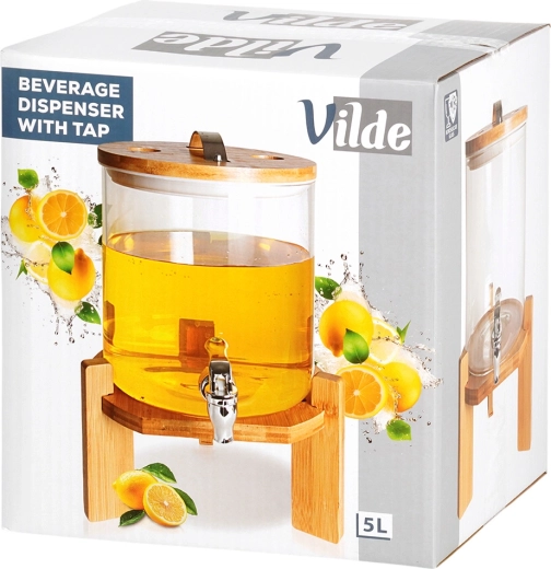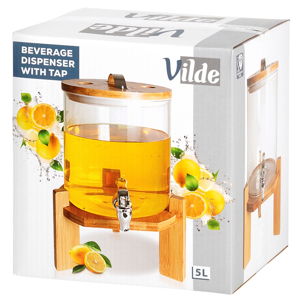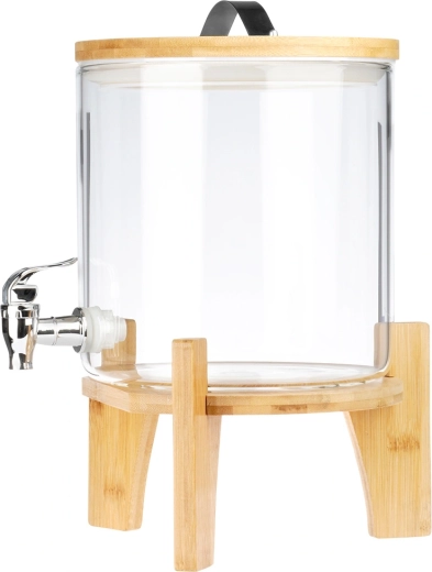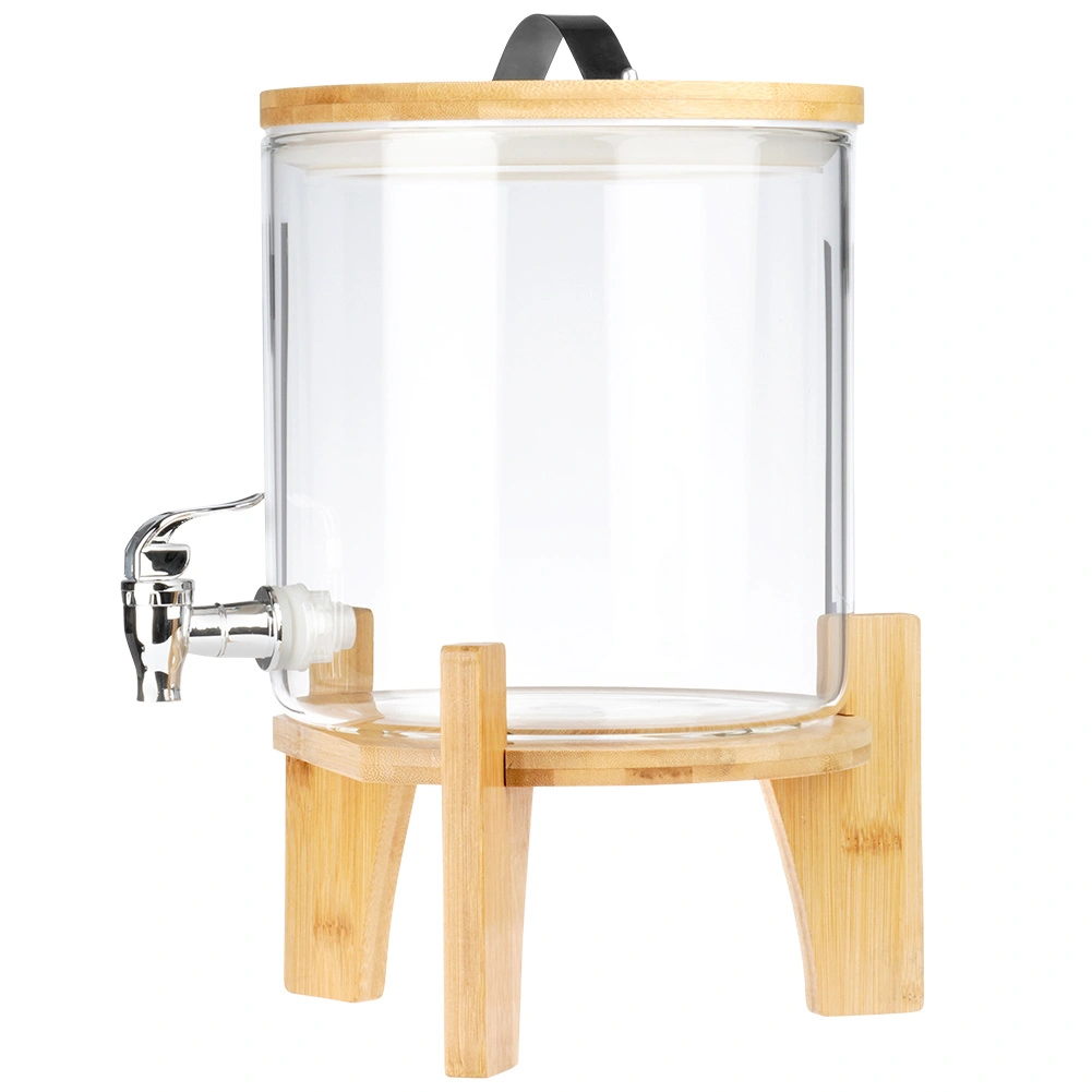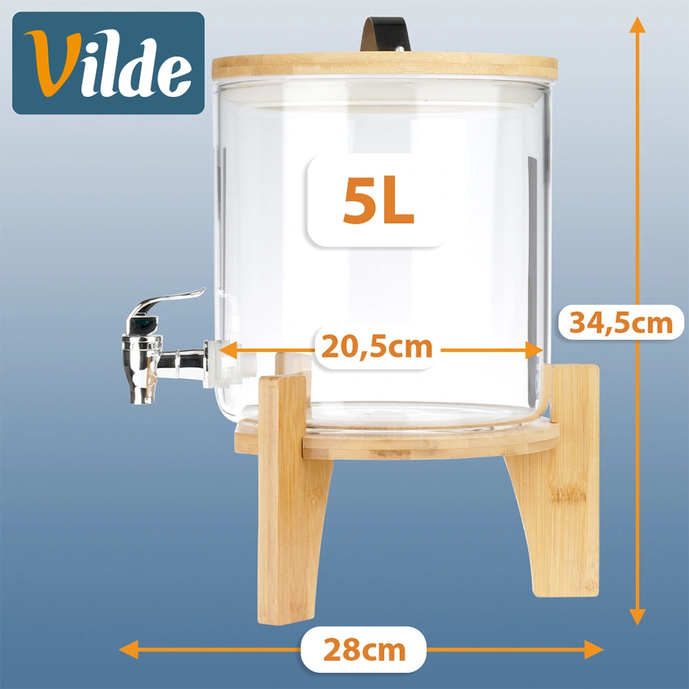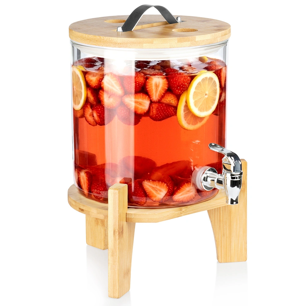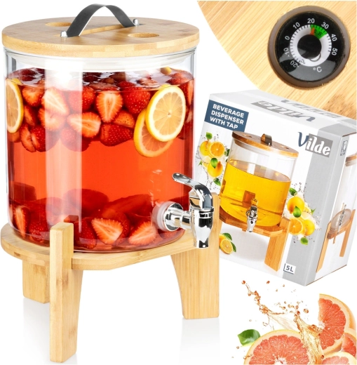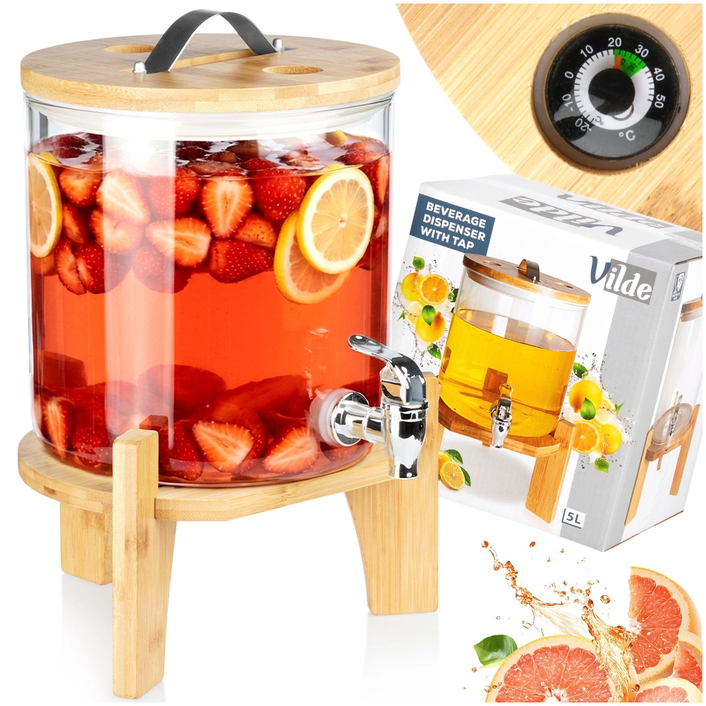 Elegant glasdispenser på 5 l med metalhane, bambusstand og låg med termometer og udluftningsventil. Fremstillet af borosilikatglas, varmebestandigt op til 100 °C, egnet til kolde og varme drikke, herunder te, punch og kombucha. Ideel til havefester, familiebegivenheder samt caféer og barer.