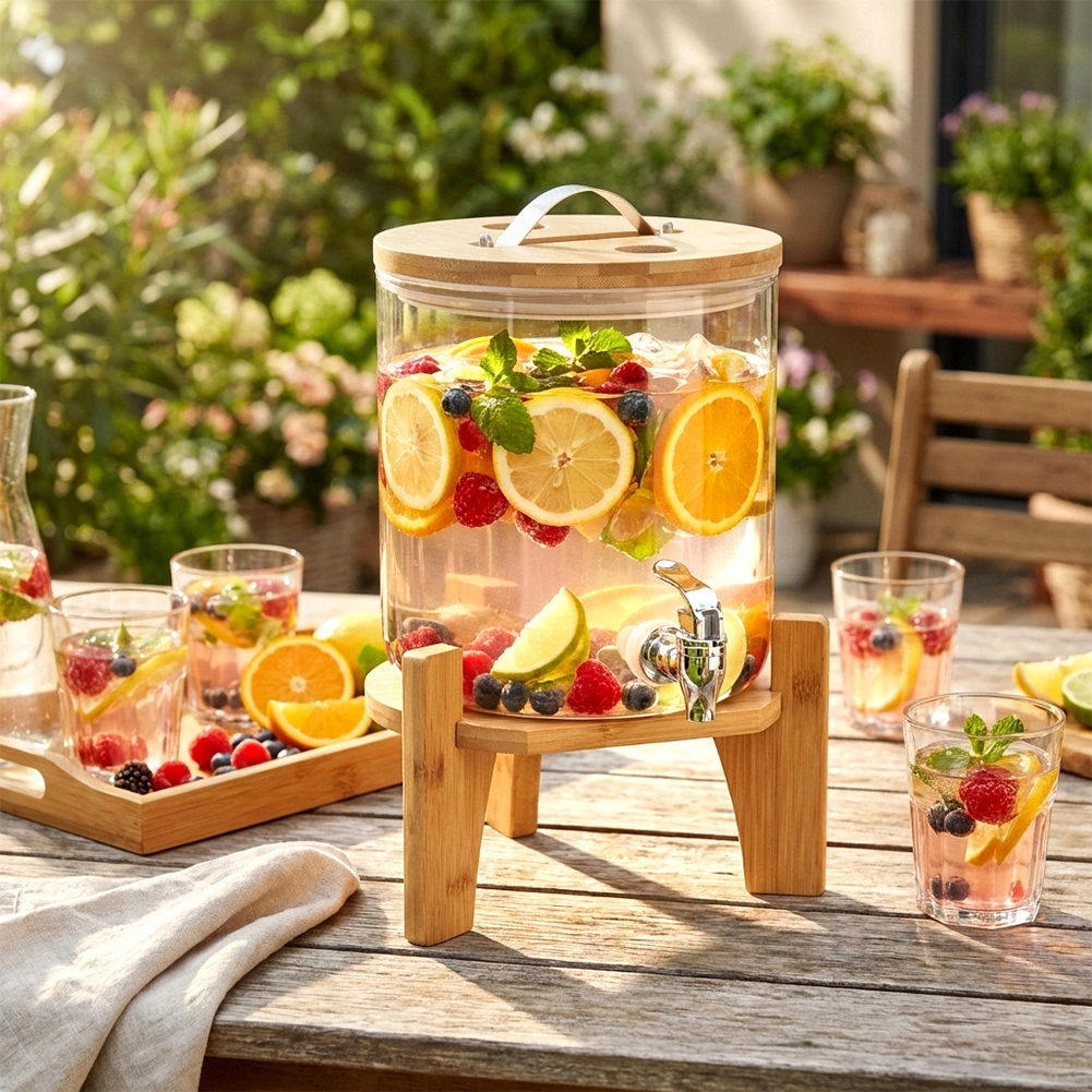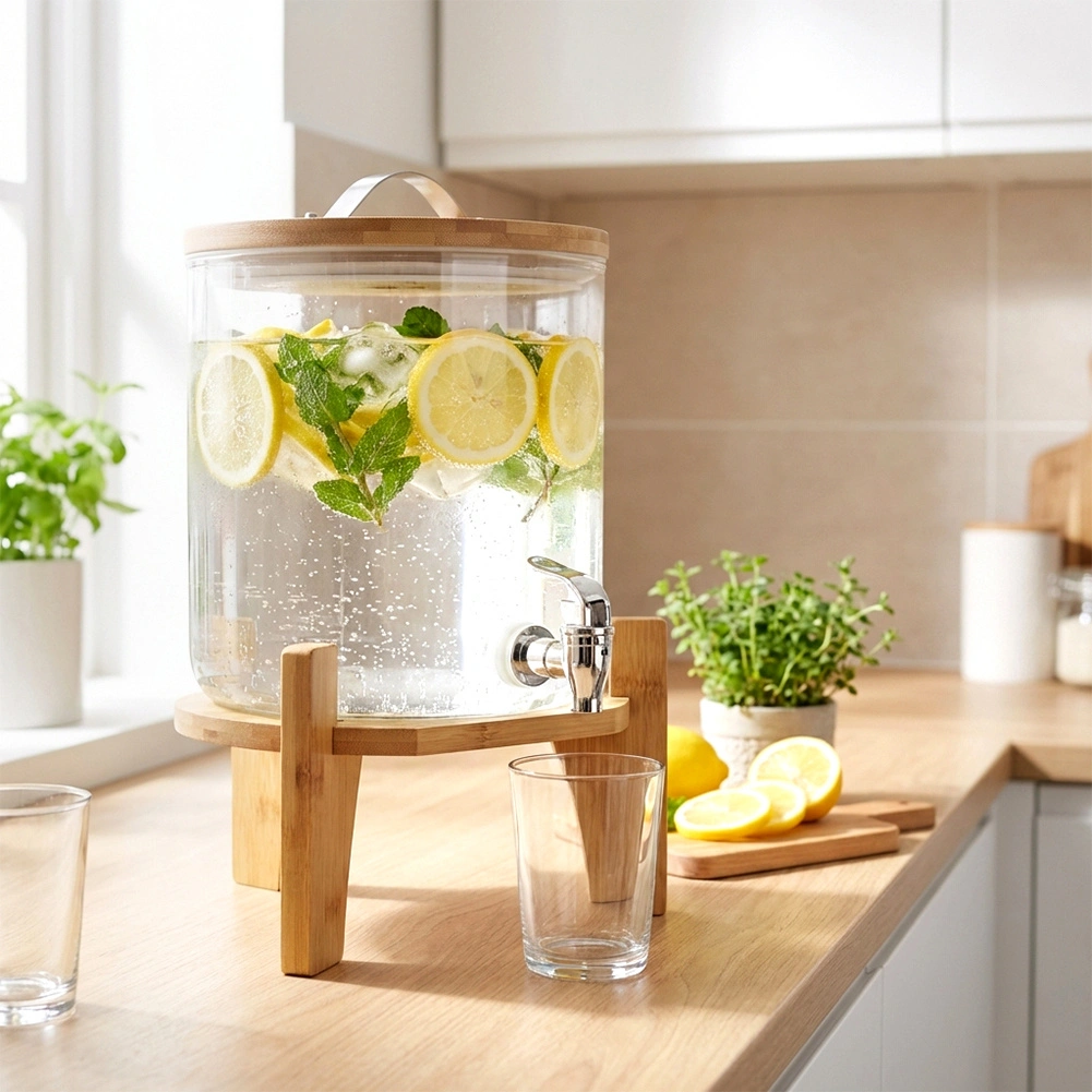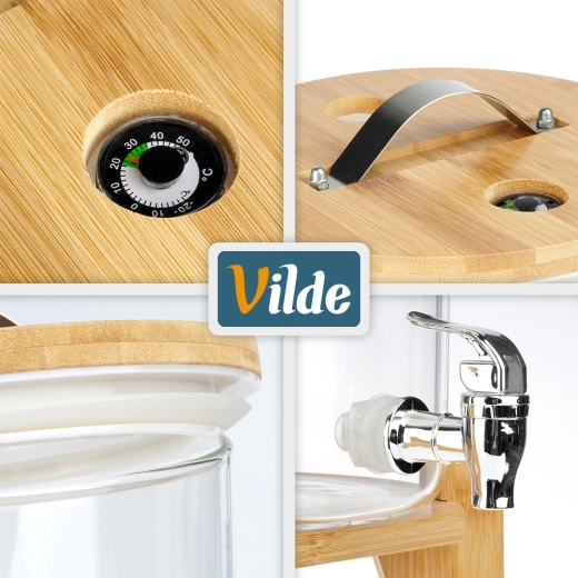 Denne alsidige drikkedispenser kombinerer rent design og praktiske detaljer: det gennemsigtige borosilikatglas gør det let at holde øje med indholdet, den stabile bambusstand giver bekvem tapning, og det præcise termometer i låget overvåger drikkens ideelle temperatur uden at skulle åbne. Udluftningsventilen hjælper med at regulere trykket ved varme eller fermenterede drikke.