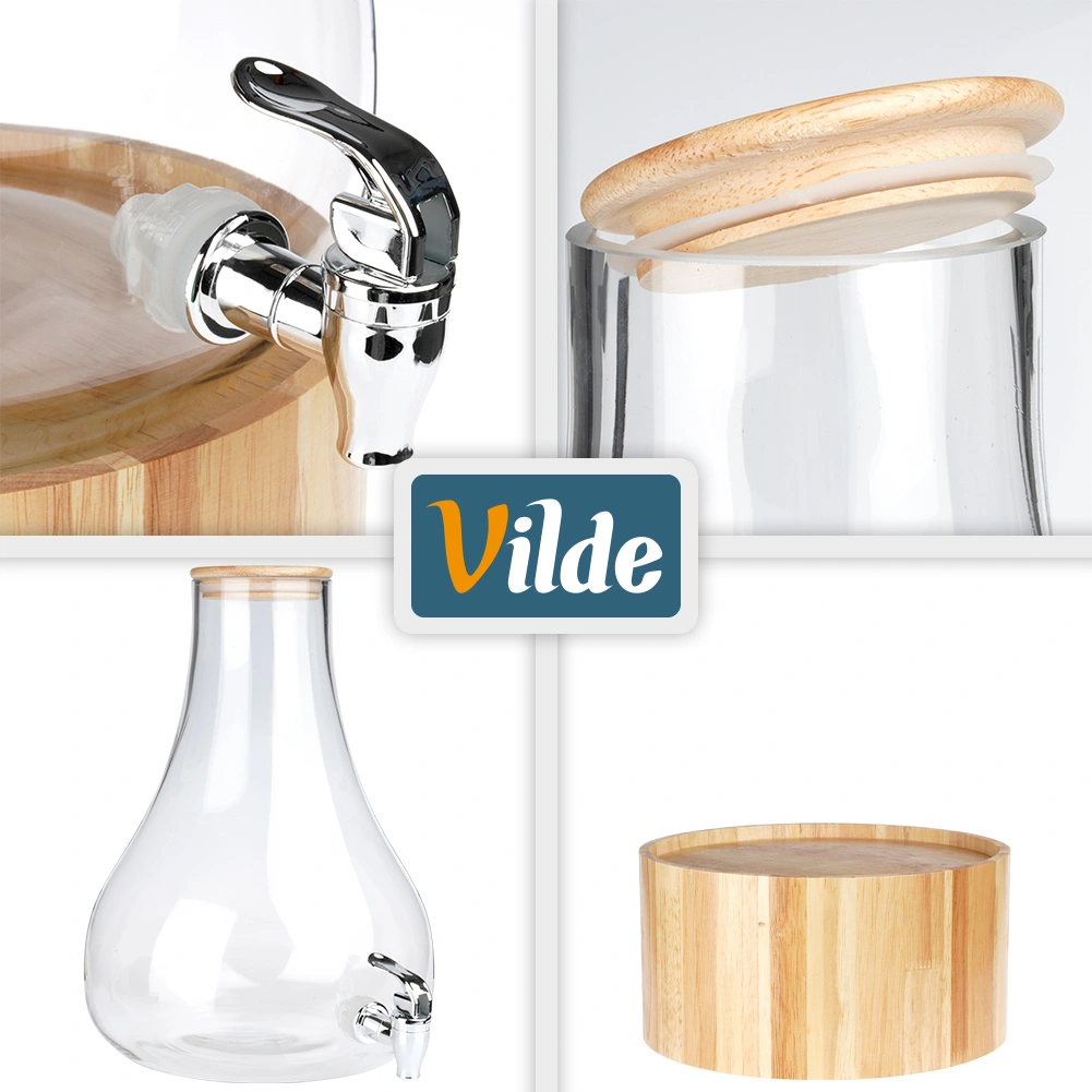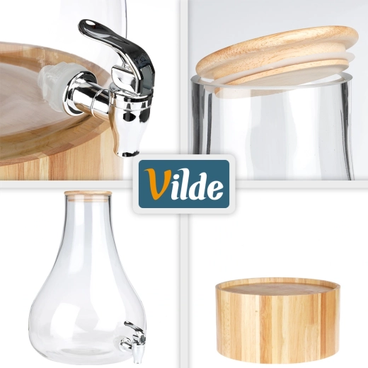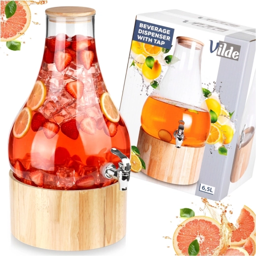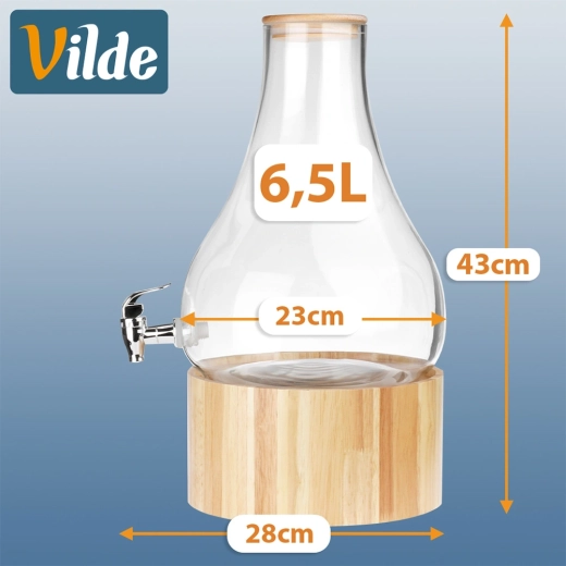 Stilfuld glaskande-dispenser på 6,5 l med træstativ og bambuslåg er ideel til servering af lemonader, vand eller punch. Takket være den praktiske hane og det forhøjede stativ er påfyldning maks. bekvemt, mens det tætsluttende bambuslåg beskytter drikkevarerne mod snavs og insekter. Holdbart, tykt glas, nem betjening og alsidig anvendelse til havefester, derhjemme og i gastronomien.