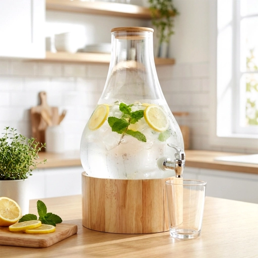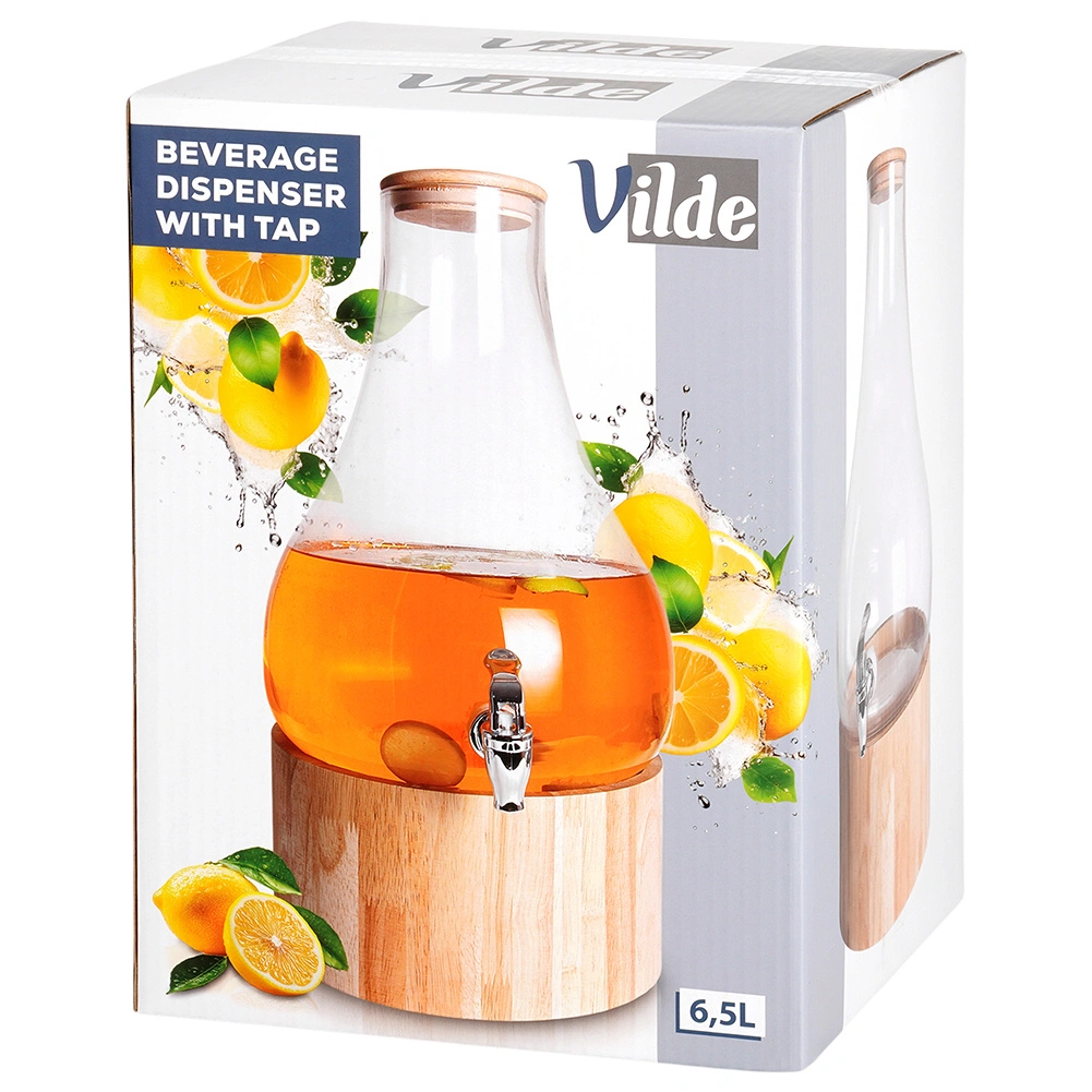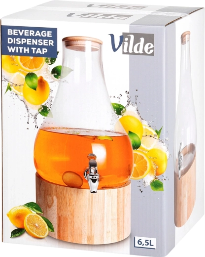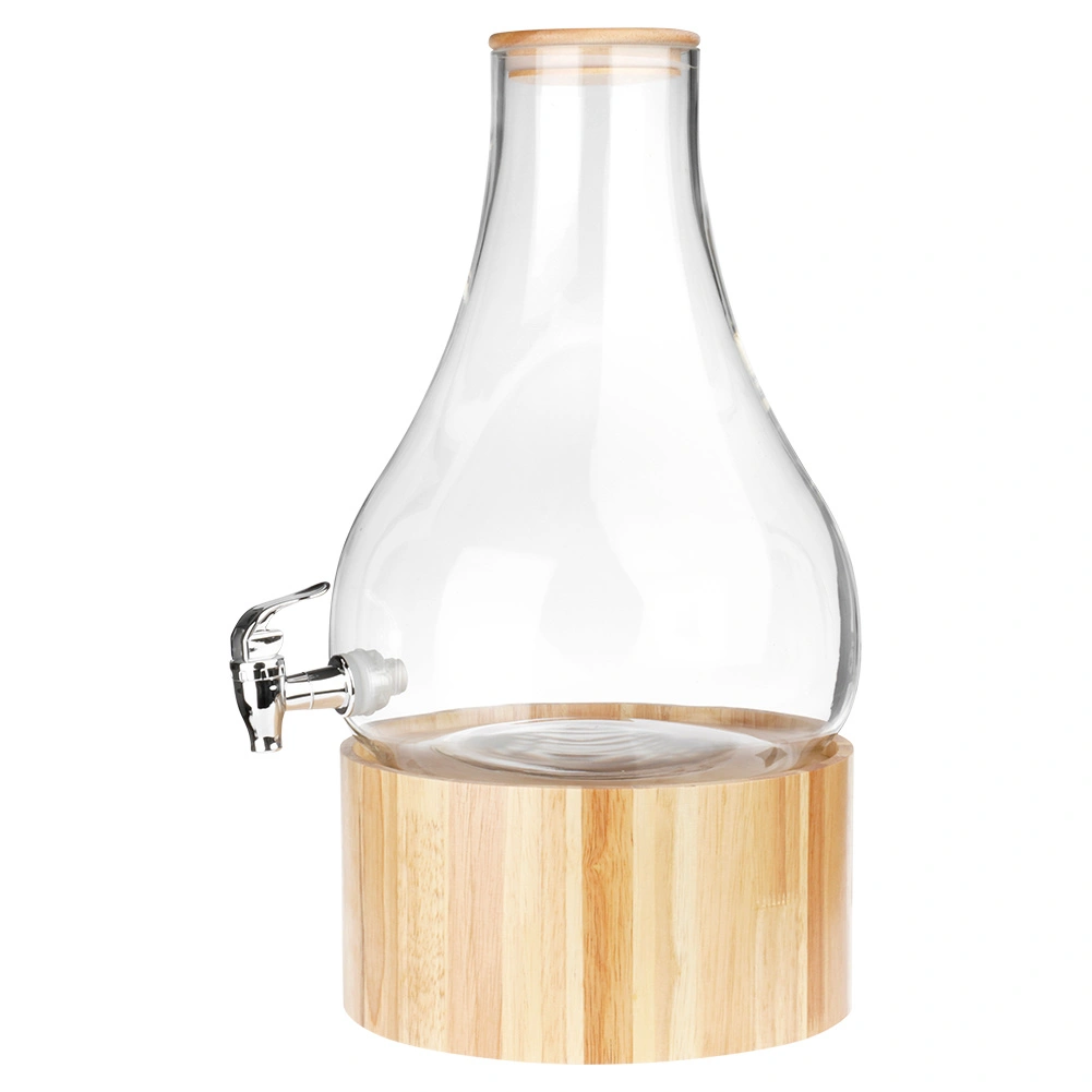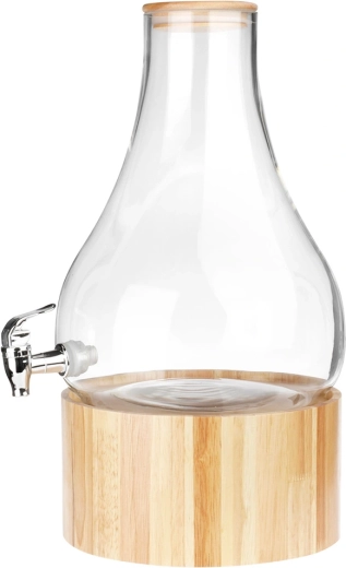 Elegant drikkedispenser af kvalitets, tykt glas kombinerer naturligt design med funktionalitet. Bambuslåg med tætningsring holder indholdet friskt og beskyttet, mens hane med metal-look giver jævn og ren servering. Takket være det stabile træstativ er udløbet i ideel højde til glas.