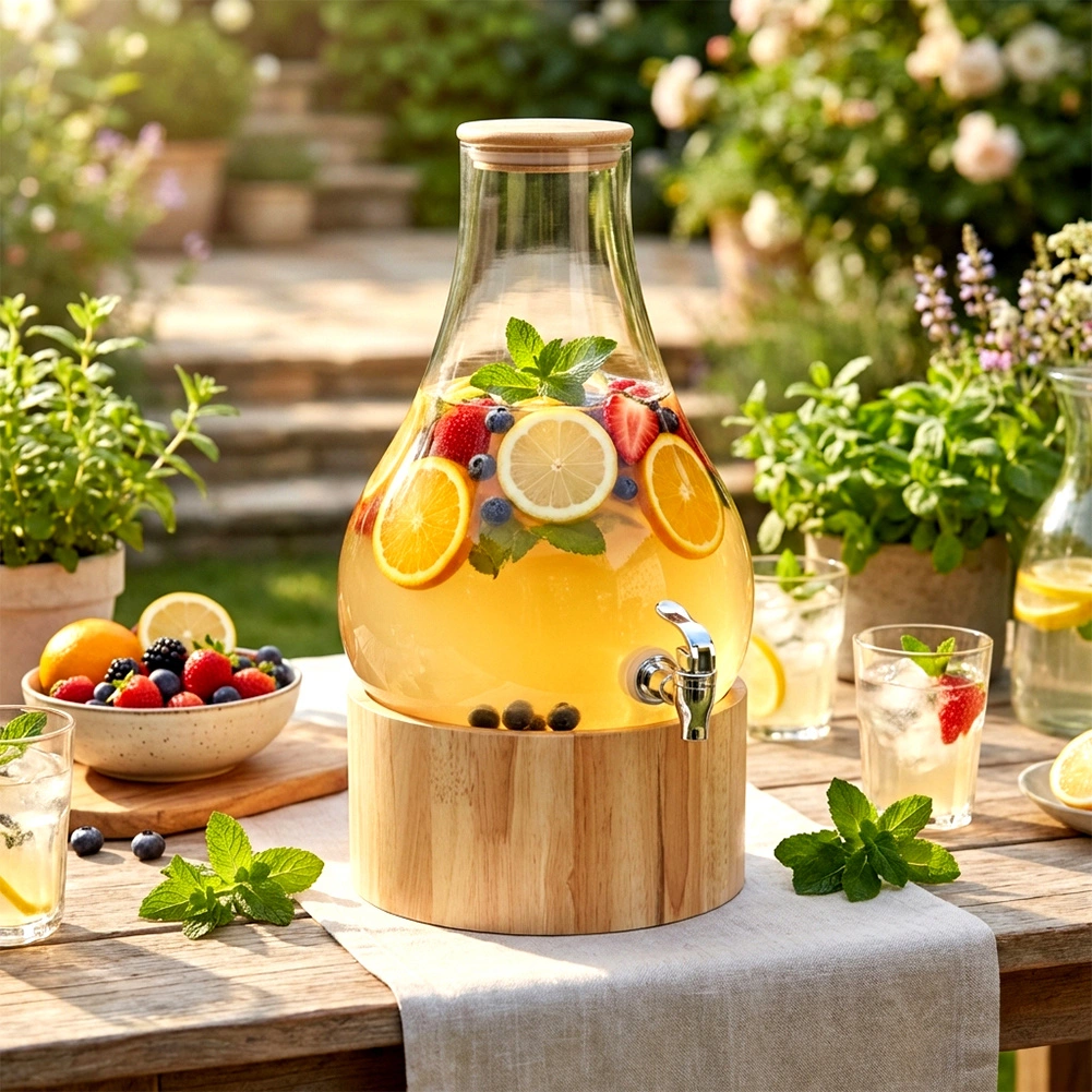 Perfekt til lemonader med frugt og is, vand, juice og iste. Brug den til havesammenkomster, familieselskaber eller i caféer og barer for en attraktiv præsentation af drikkevarer. Fremstillet efter europæiske standarder af materialer sikre til kontakt med fødevarer. Ikke egnet til varme drikke.