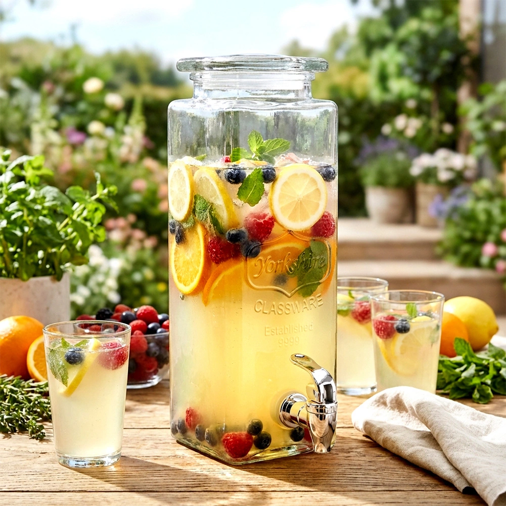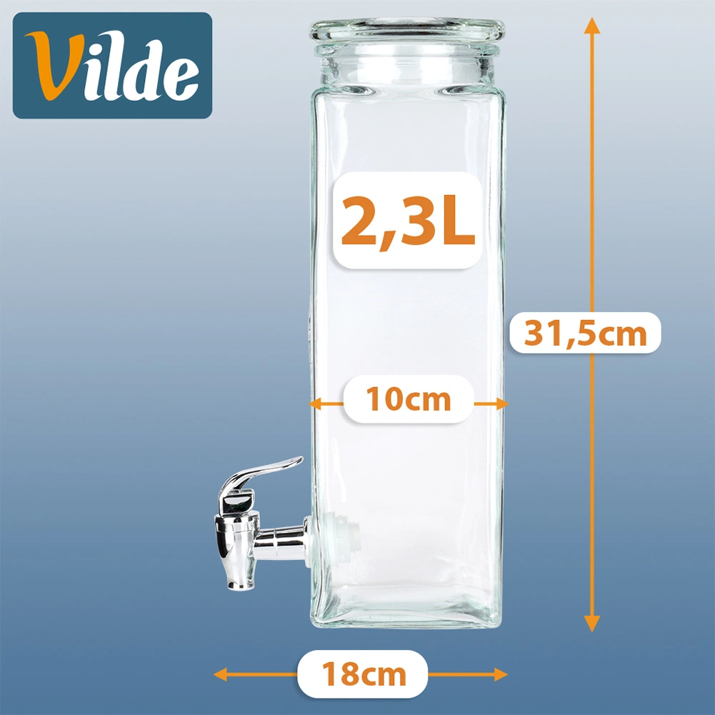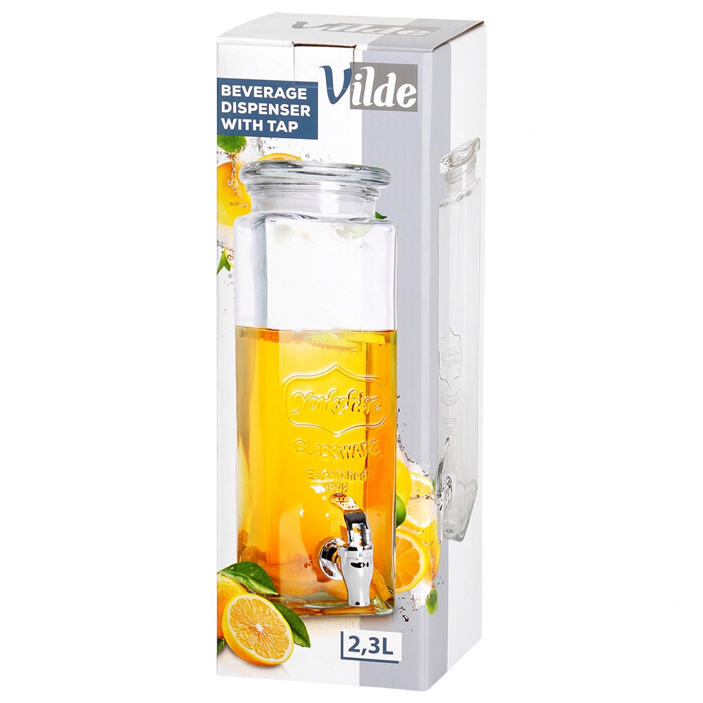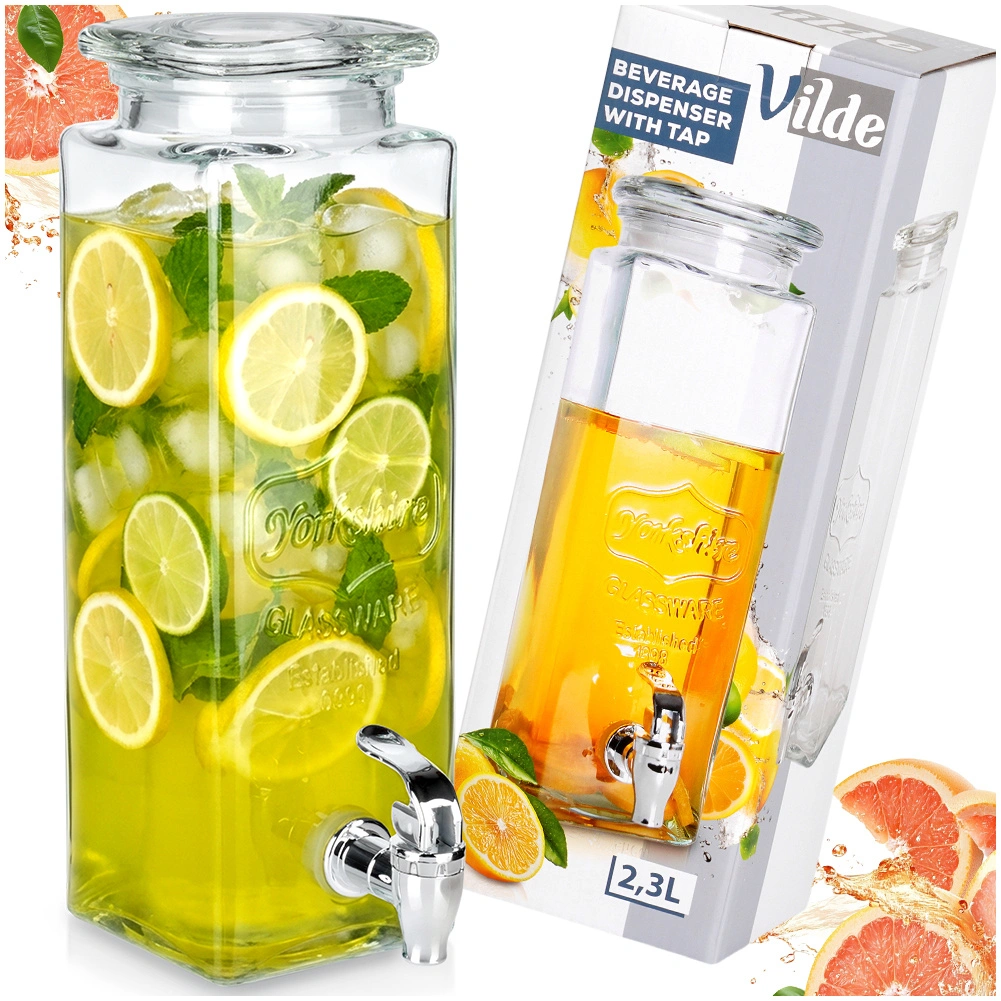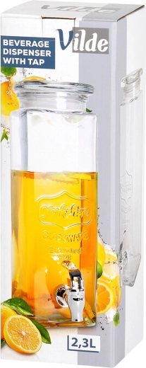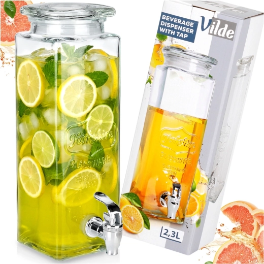 Glasdispenseren til drikkevarer på 2,3 l er perfekt til forfriskende lemonader, vand med citrus og mynte, hjemmelavede juicer eller punch. Det klare, tykke glas med reliefskrift og den metal-look hane giver et elegant udtryk og sikrer bekvem og kontrolleret servering uden spild. Låget med tætning beskytter drikken mod snavs og insekter, så den egner sig både til indendørs brug og på terrassen.