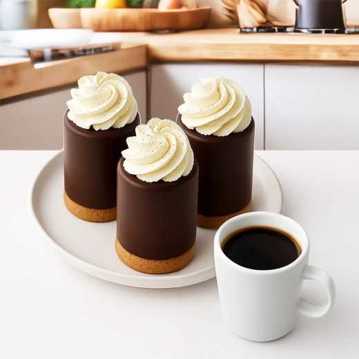 Skab stilfulde desserter i den originale “bæger”-form med plads til fyld. Silikoneformen i beige er lavet af fødevaregodkendt silikone, som er fleksibel, ikke optager lugte eller smag og sikrer nem udtagning uden at brænde på. Ideel til chokoladekurve, cremede mousser, is-praliner og bagte mini-kager.