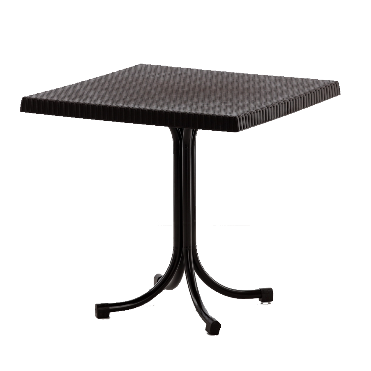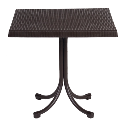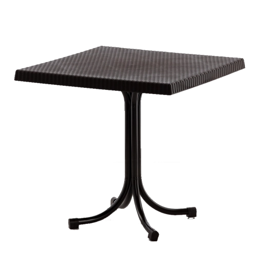 Bring varme og stil til dit udendørsområde med dette praktiske bord i målene 80 × 80 × 73 cm. Bordpladen af kvalitetsplast imiterer rattan troværdigt, matcher smukt med naturlige arrangementer og er samtidig nem at rengøre. Det centrale stålben giver høj stabilitet og fri benplads samt nem placering af stole.