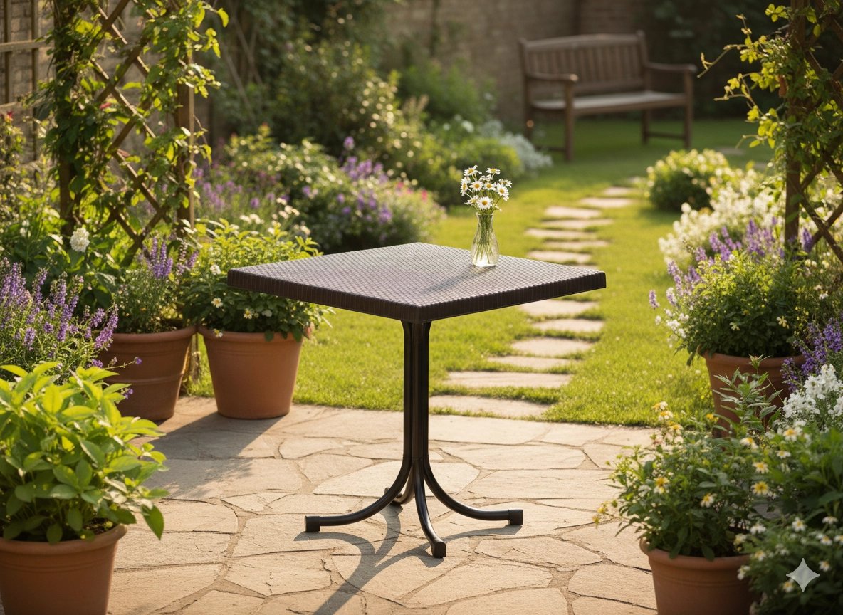 Det kompakte kvadratiske format 80 × 80 cm passer til altaner, terrasser og havehjørner uden at optage for meget plads.