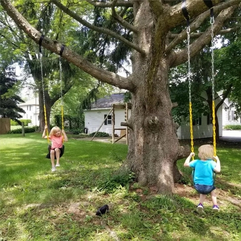 Sno remmen rundt om en gren eller en bjælke, træk igennem og sikr med karabinen. Den enkle proces klares af alle uden værktøj.
