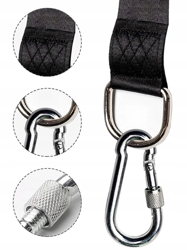 Forstærkede syninger, solide D-ringe og skruekarabiner sikrer en stabil forbindelse og pålidelig udendørs brug.