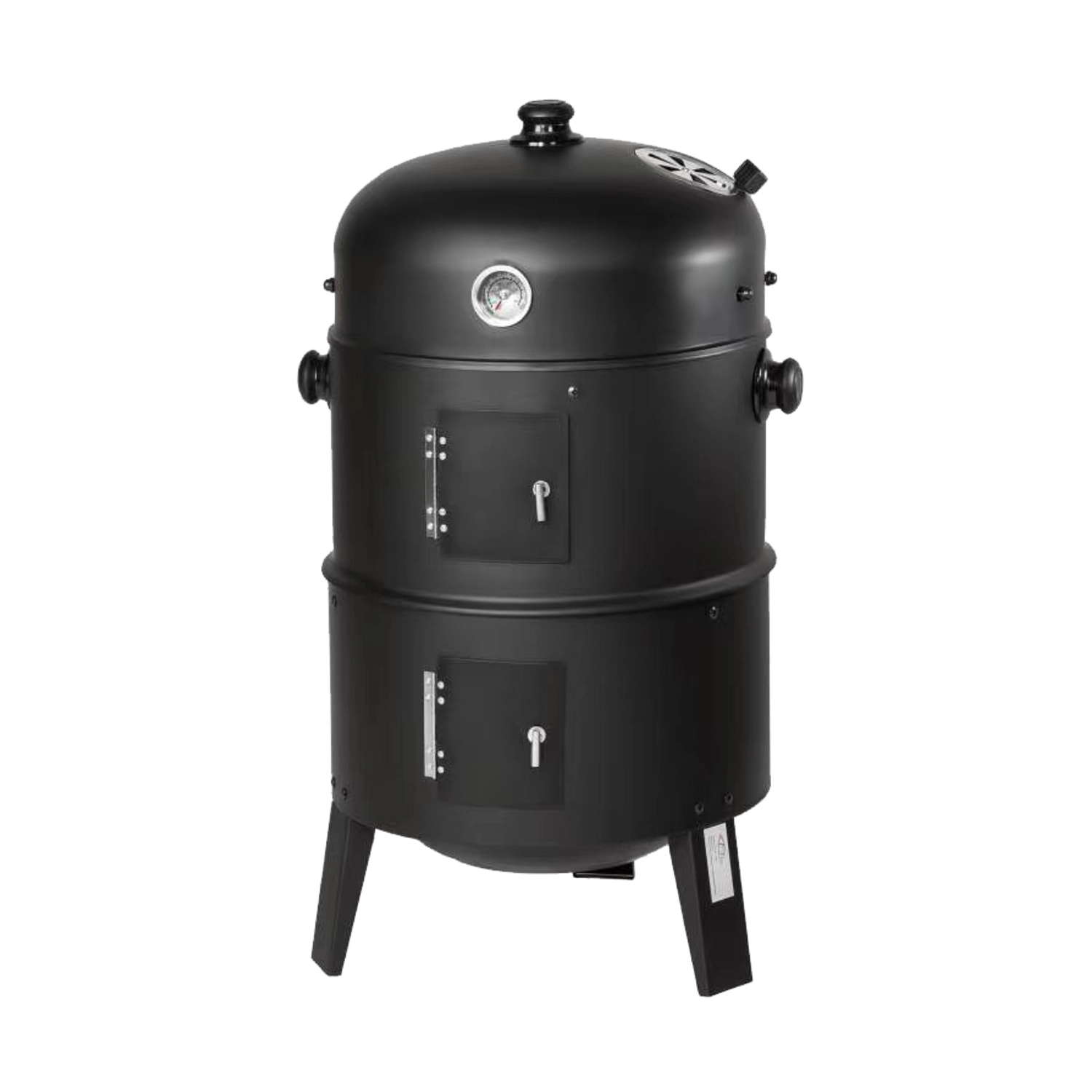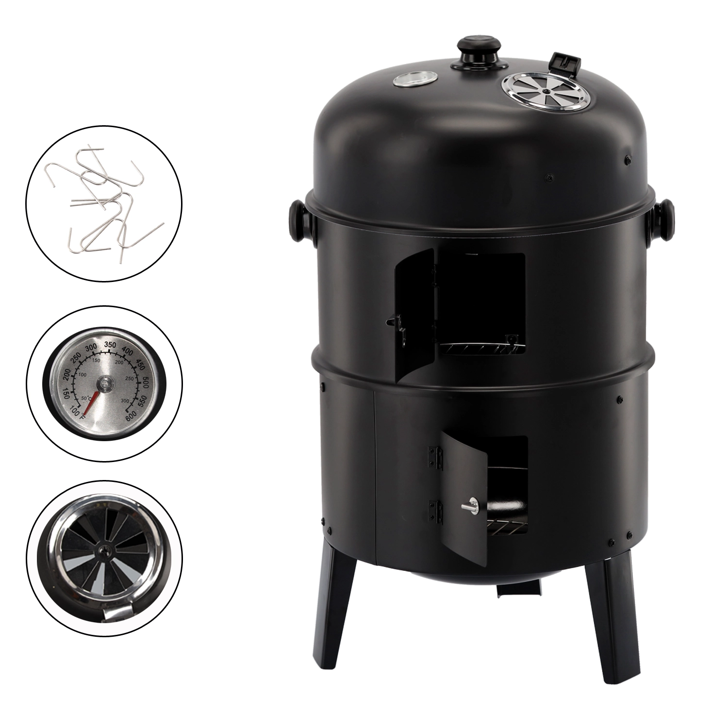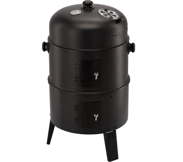 Denne vertikale kulgrill/røgovn tilbyder to niveauer af riste (Ø 37 cm) til samtidig tilberedning af flere retter samt praktiske to frontlåger til påfyldning af brændsel eller kontrol af maden. Et indbygget termometer i kuppellåget og justerbar ventilation giver stabil temperatur til både langsom røgning og klassisk grillning.