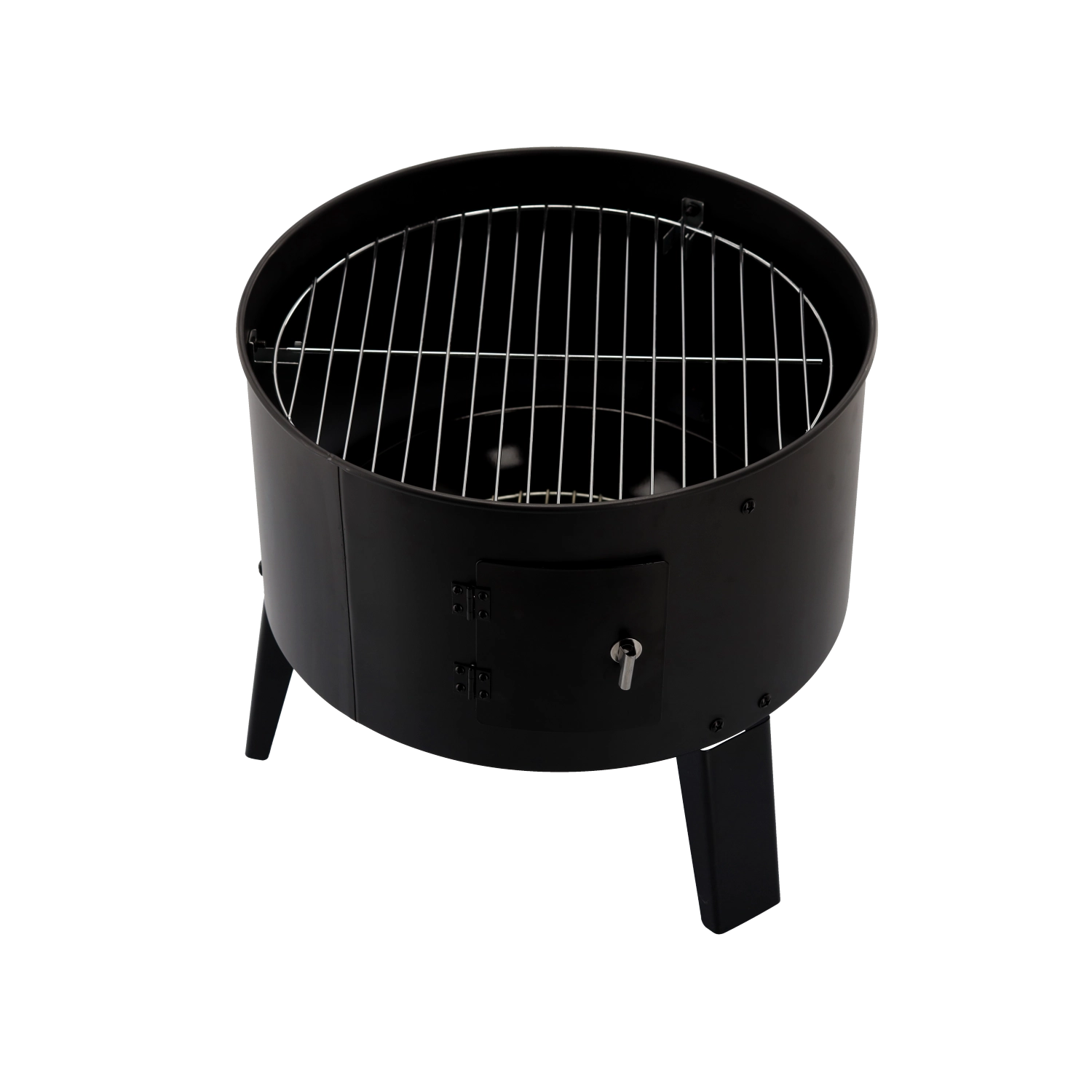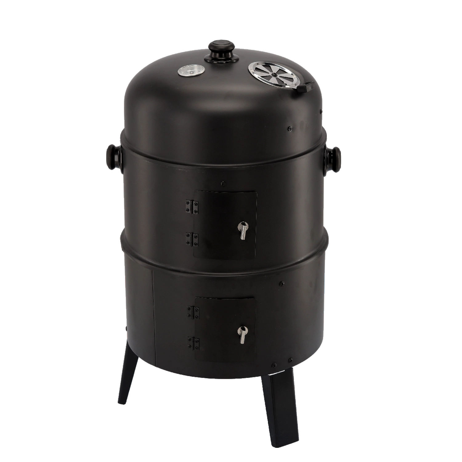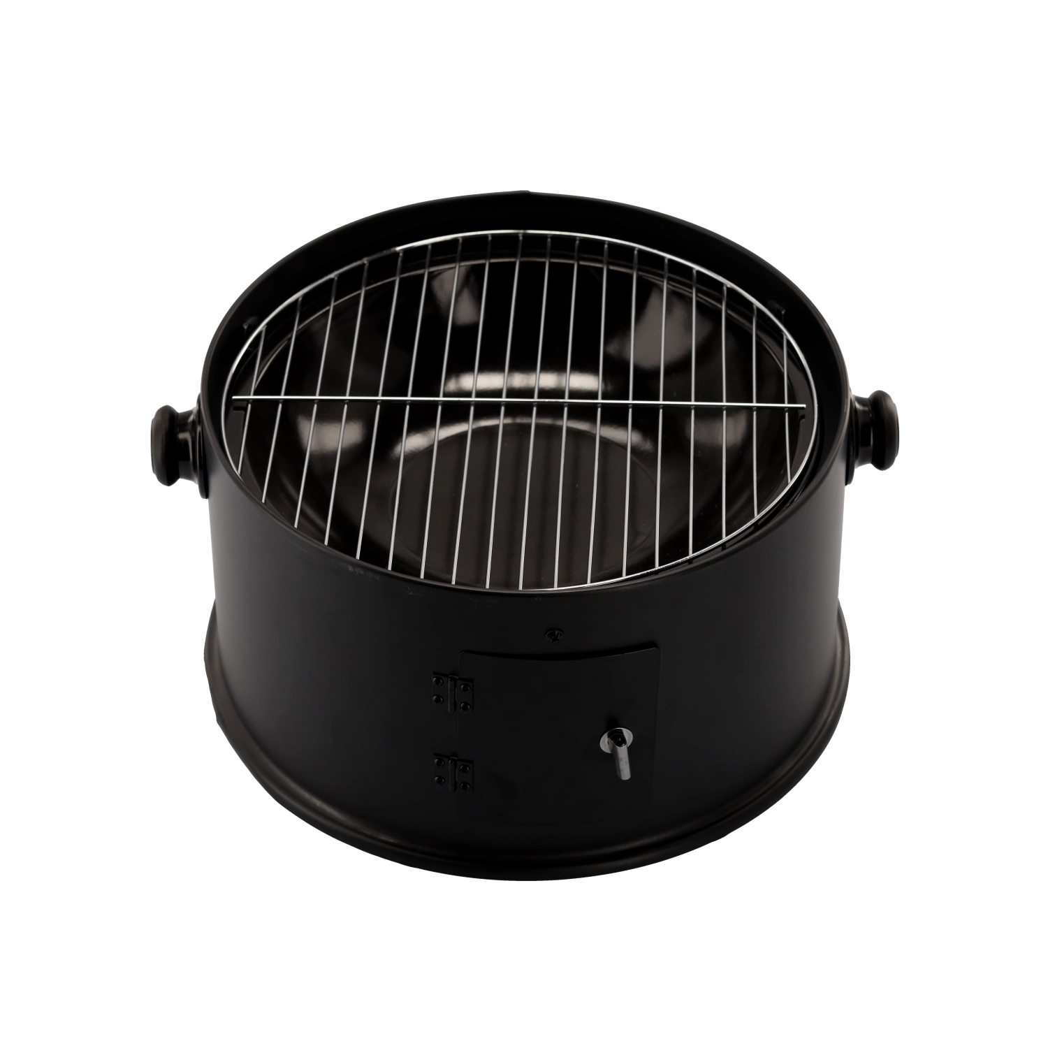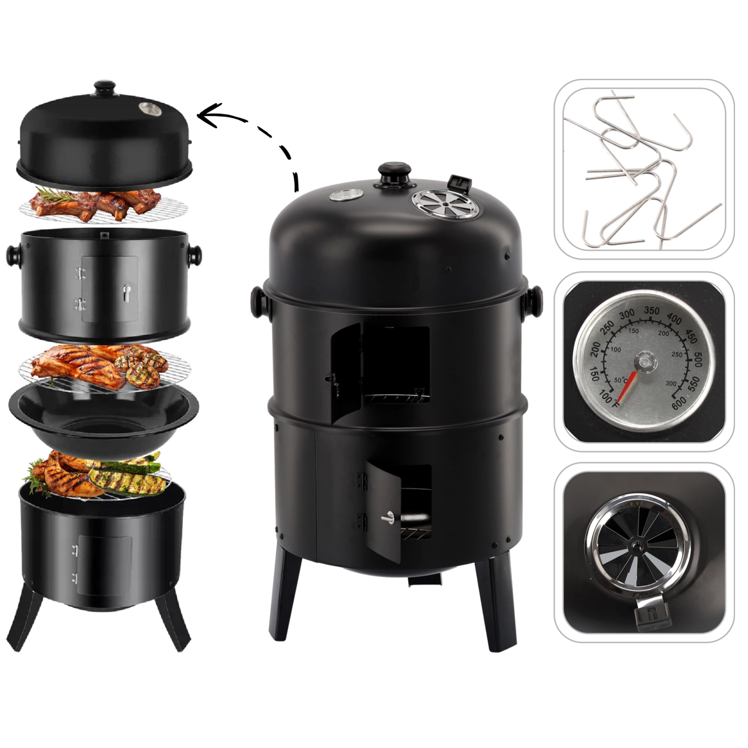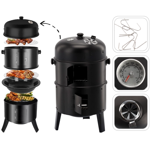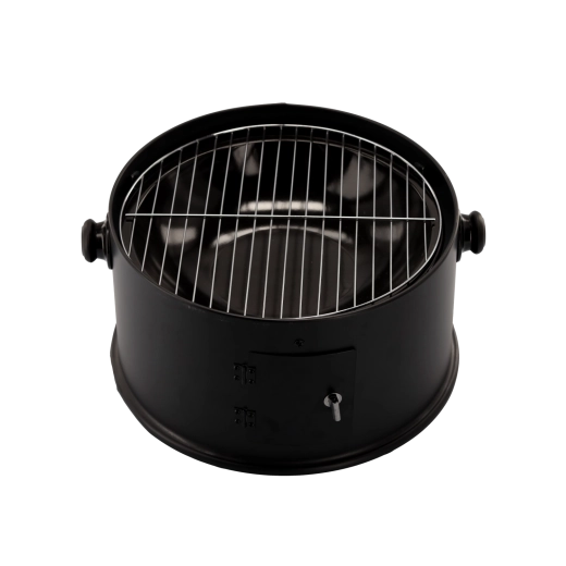 Den robuste metalkonstruktion med sammenklappelige/aftagelige sektioner gør transport og rengøring let. Inkluderer kroge til røgning og to emaljerede skåle – vandbakke og fyrskål med rist – for saftigere resultater og renere drift. Et perfekt valg til have, terrasse og picnic.