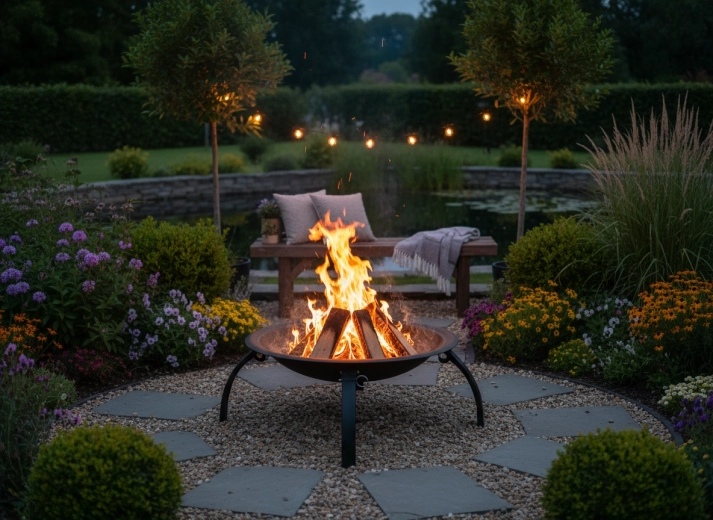 Der medfølger en ildrager med behageligt træhåndtag til sikker påfyring og håndtering af ilden. Den åbne skål giver god lufttilførsel, stabil flamme og jævn varmeafgivelse – ideelt til havesammenkomster, grillning på rist eller ristning af pølser.