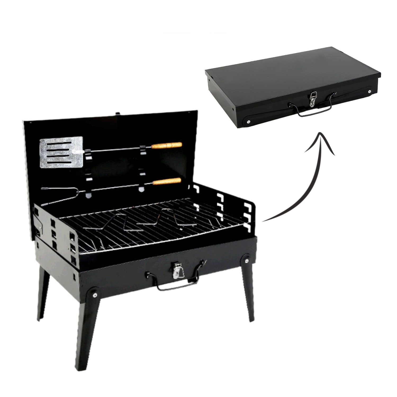Kompakt, bærbar kulgrill i praktisk kuffertdesign til camping, picnics og haven. Takket være sammenklappelige ben, låsbart låg og integreret sæt redskaber er det nemt og sikkert at grille hvor som helst. Stabil konstruktion, hurtig samling og nem transport sparer plads og tid.