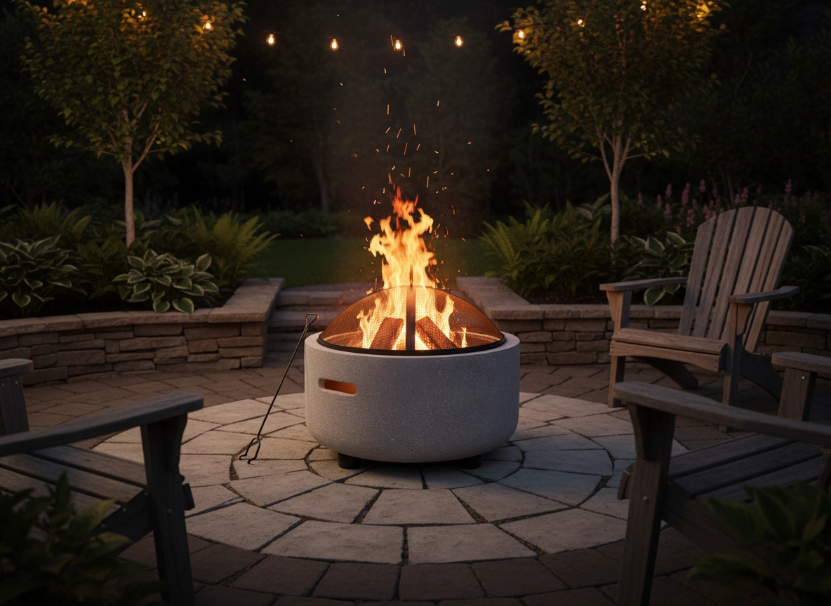 Nyd stemningen fra de dansende flammer på terrassen eller i haven. Det moderne bålsted med en skål af holdbart MgO i en diskret grå farve passer perfekt ind i ethvert udemiljø og sikrer stabil og sikker drift. Den stålfremstillede gnistkuppel beskytter mod flyvende gnister, og ildrageren gør det lettere at håndtere brænde.
