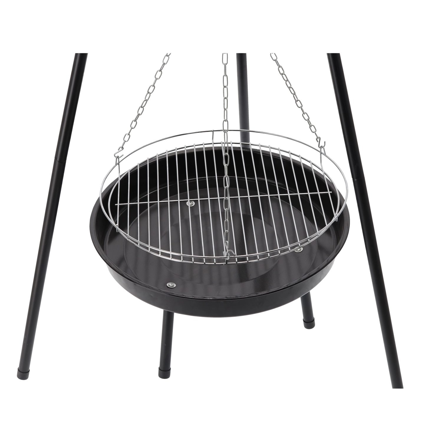 Denne udendørs trefodsgrill kombinerer friheden ved madlavning over glødende kul med praktiske detaljer til daglig brug. Den forkromede rist med en diameter på 49,5 cm, ophængt i kæder, sikrer jævn opvarmning og nem højdejustering over ilden. Den emaljerede ildskål med en diameter på 50 cm er slidstærk, let at rengøre og holder længe på varmen.