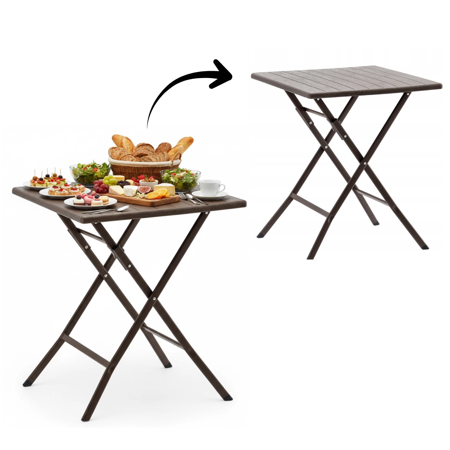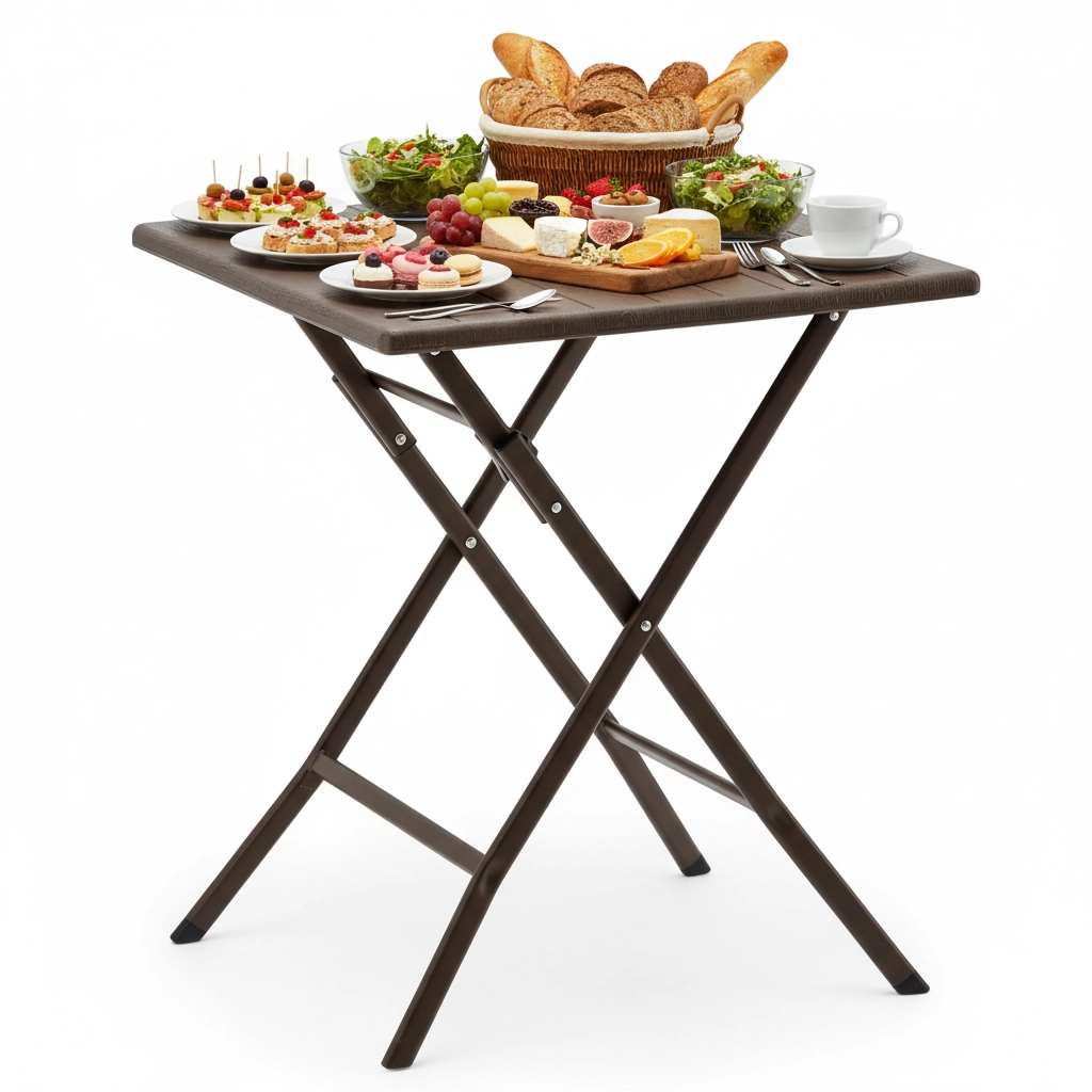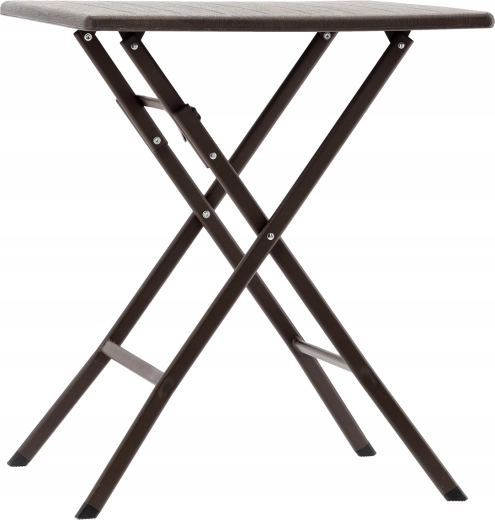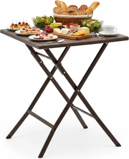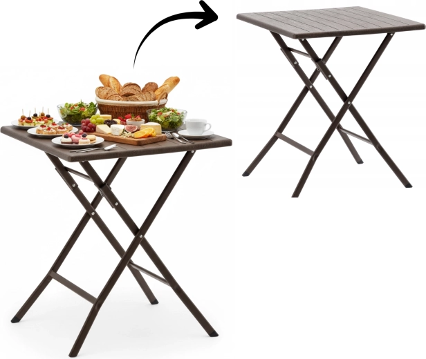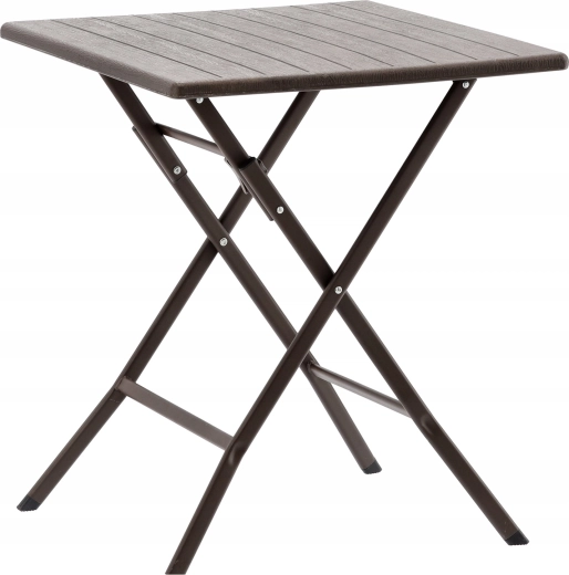 Det praktiske, sammenklappelige campingbord med målene 61,5 × 61,5 × 73 cm kombinerer let vægt med høj stabilitet. Overfladen i brun trædekor matcher let med udendørsmøbler, og takket være de sammenklappelige ben kan det på få øjeblikke gemmes væk selv på små arealer.