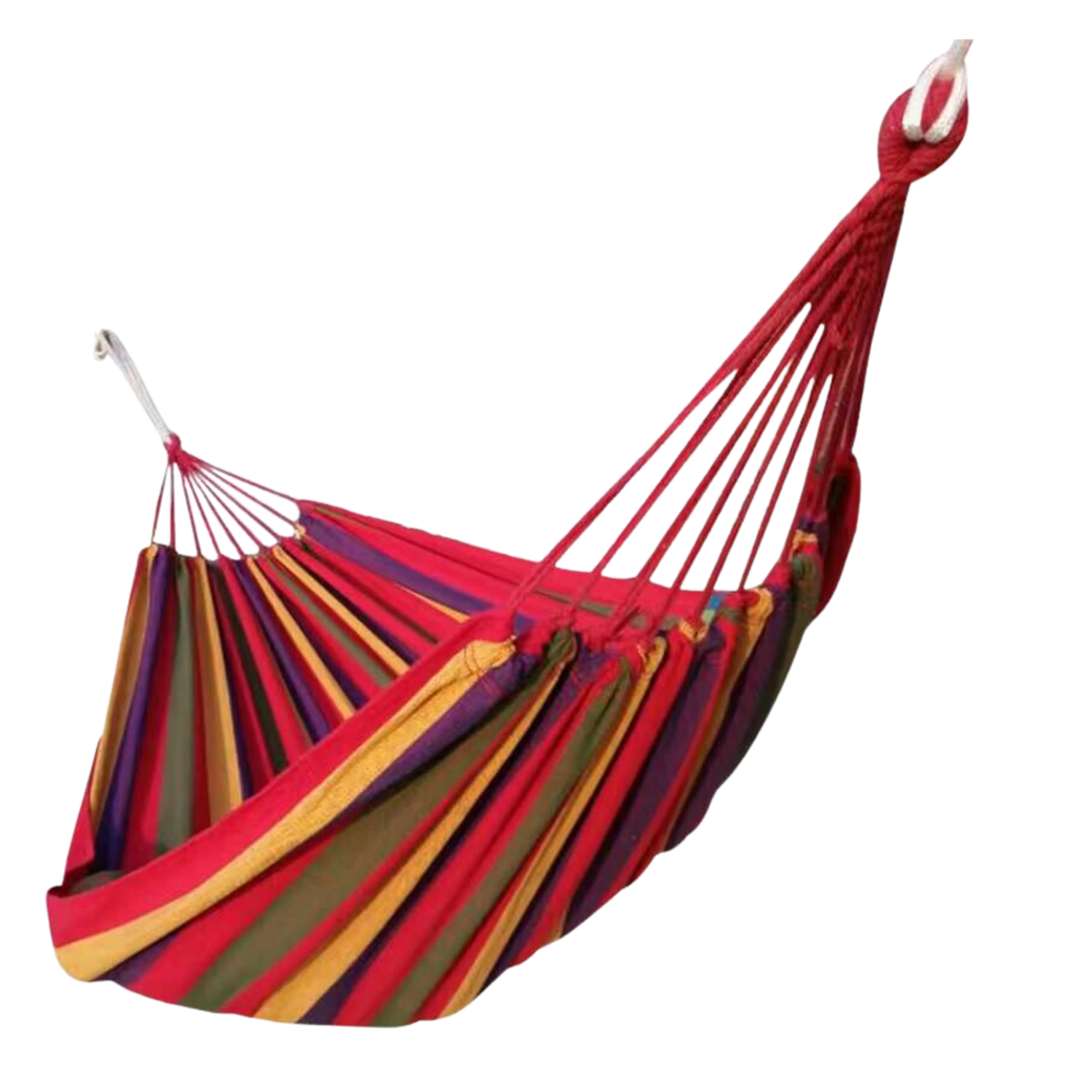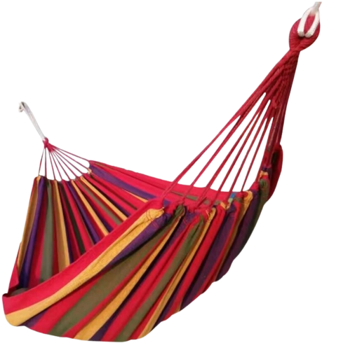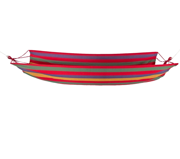 Nyd en velfortjent pause i haven, på terrassen eller altanen med denne komfortable hængekøje i røde striber. Den er lavet af en slidstærk blanding af polyester og bomuld, har rige mål på 200 × 100 cm og en maksimal belastning på op til 150 kg for sikker og behagelig afslapning.