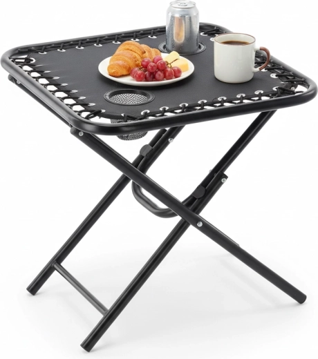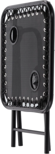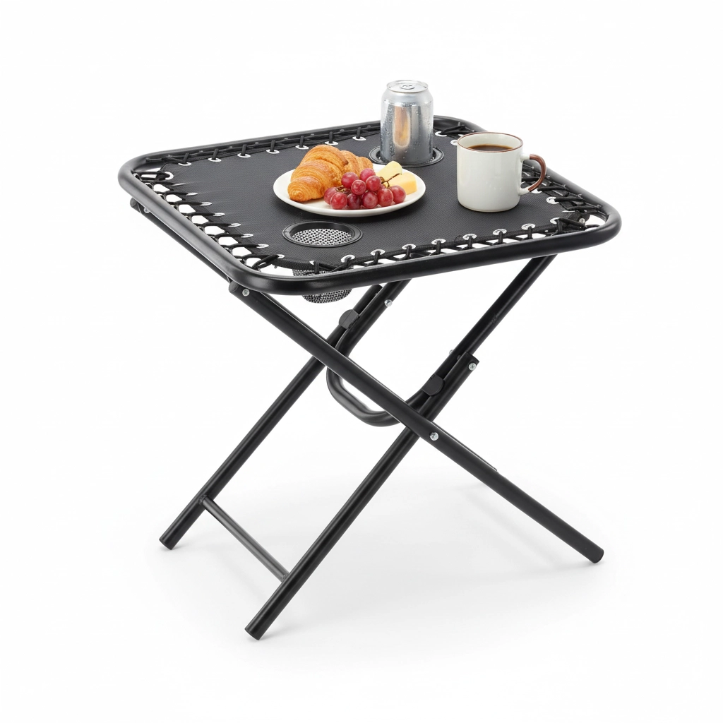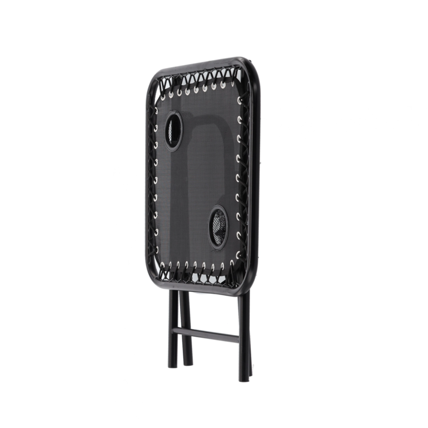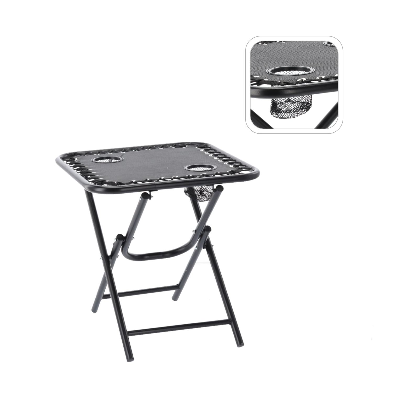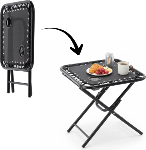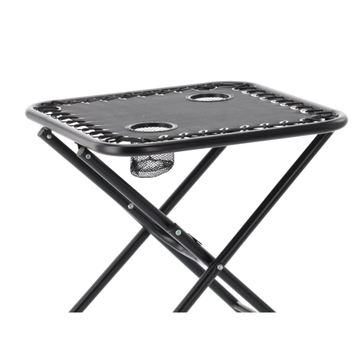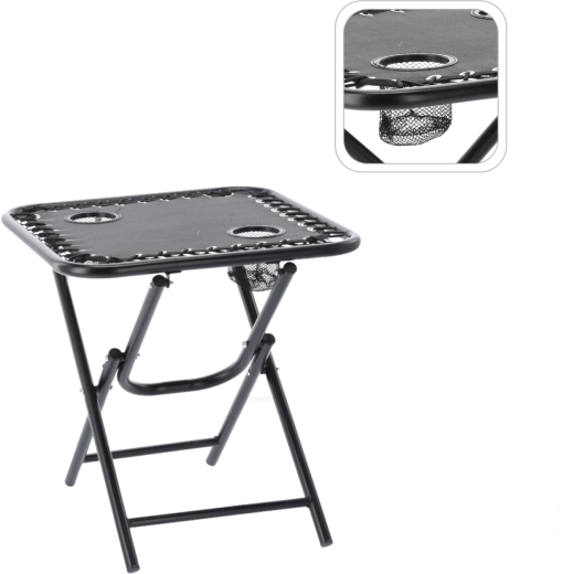 Leder du efter et praktisk bord til rejsen, som kan sættes op på få sekunder? Dette sorte sammenklappelige turistbord kombinerer stabiliteten fra en metalramme med et let og bærbart design. To indbyggede holdere sikrer kopper og dåser, så du altid har dine drikkevarer lige ved hånden.