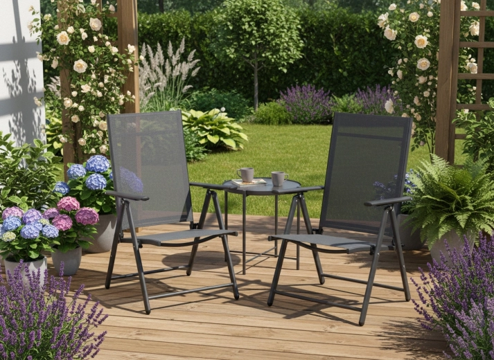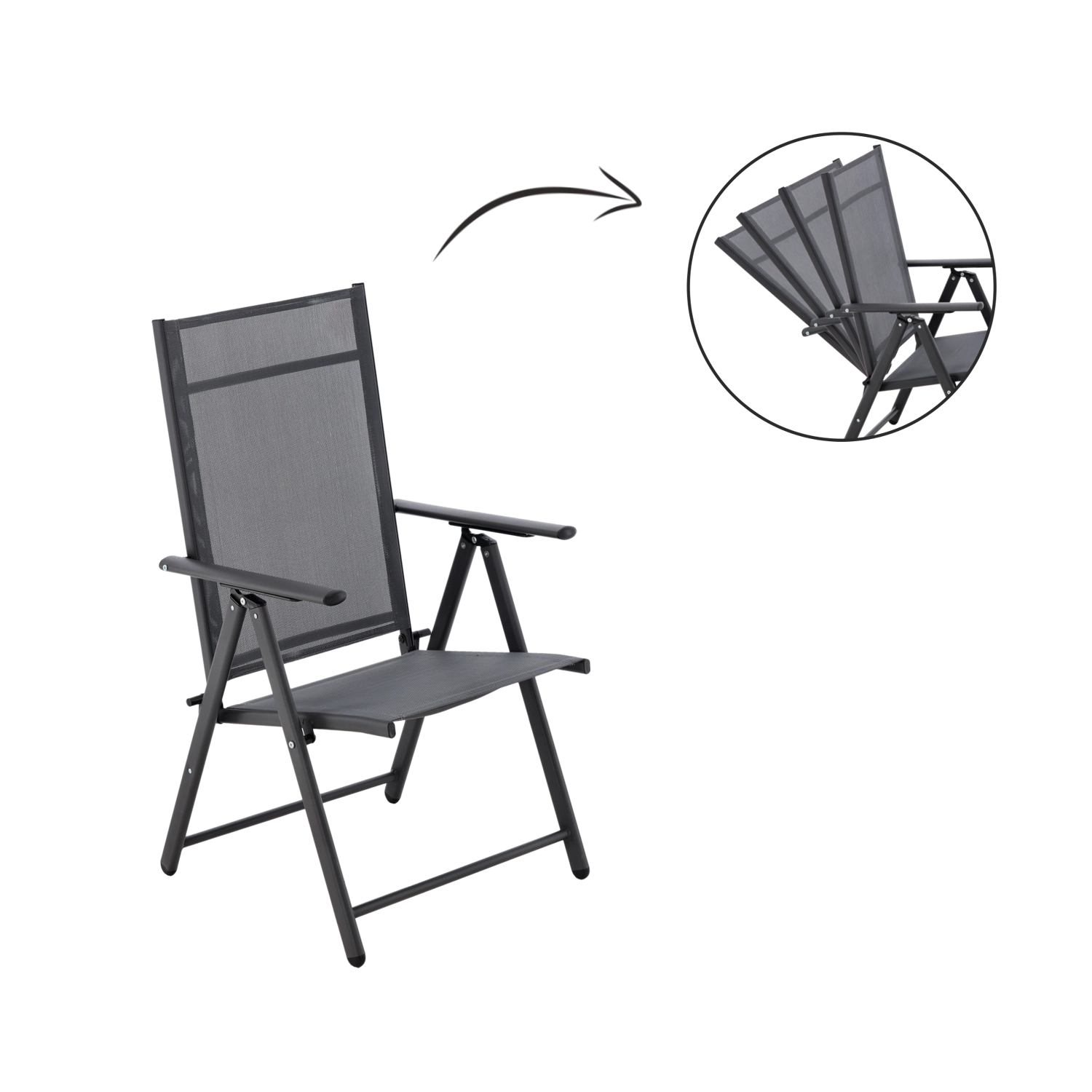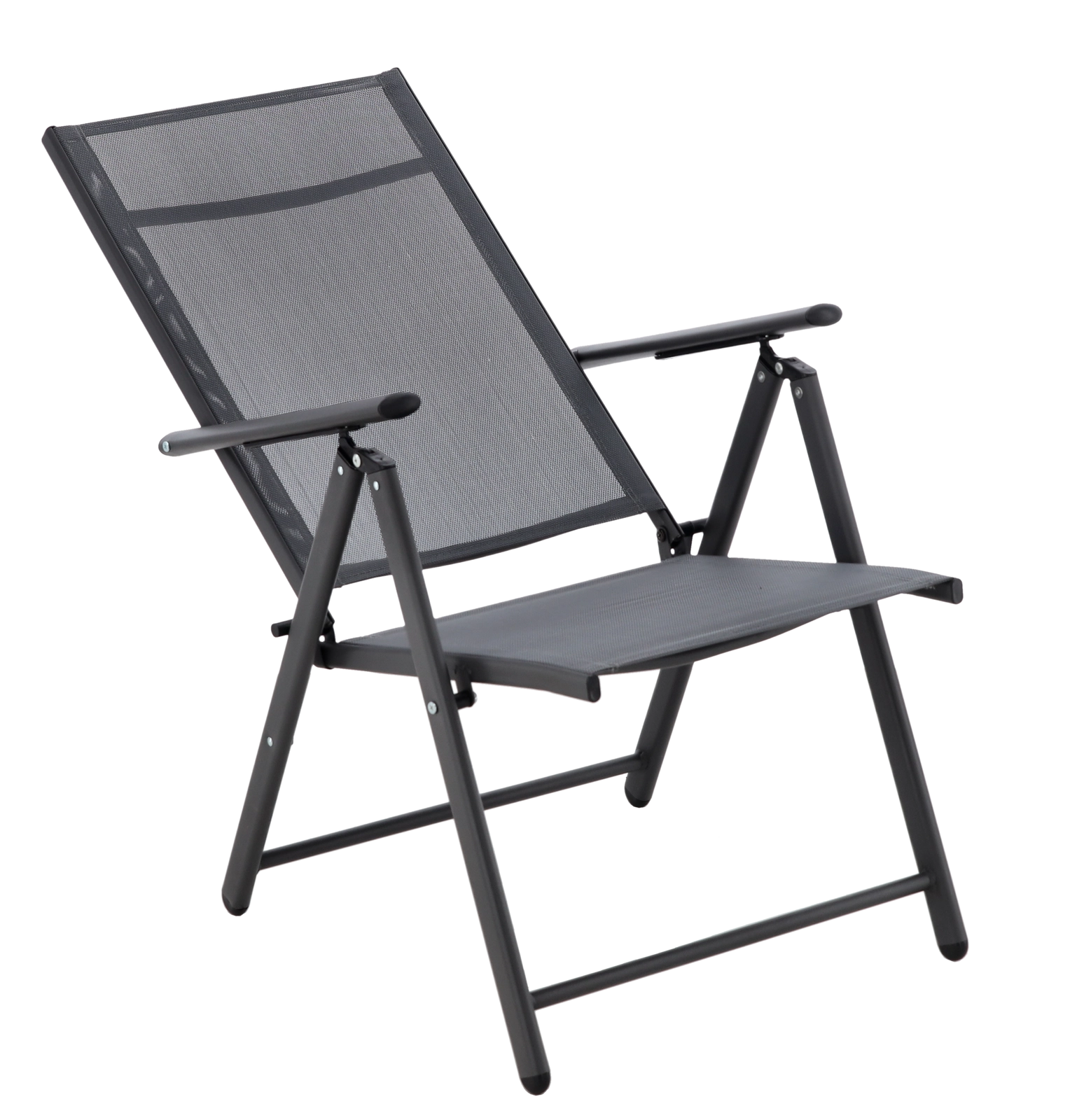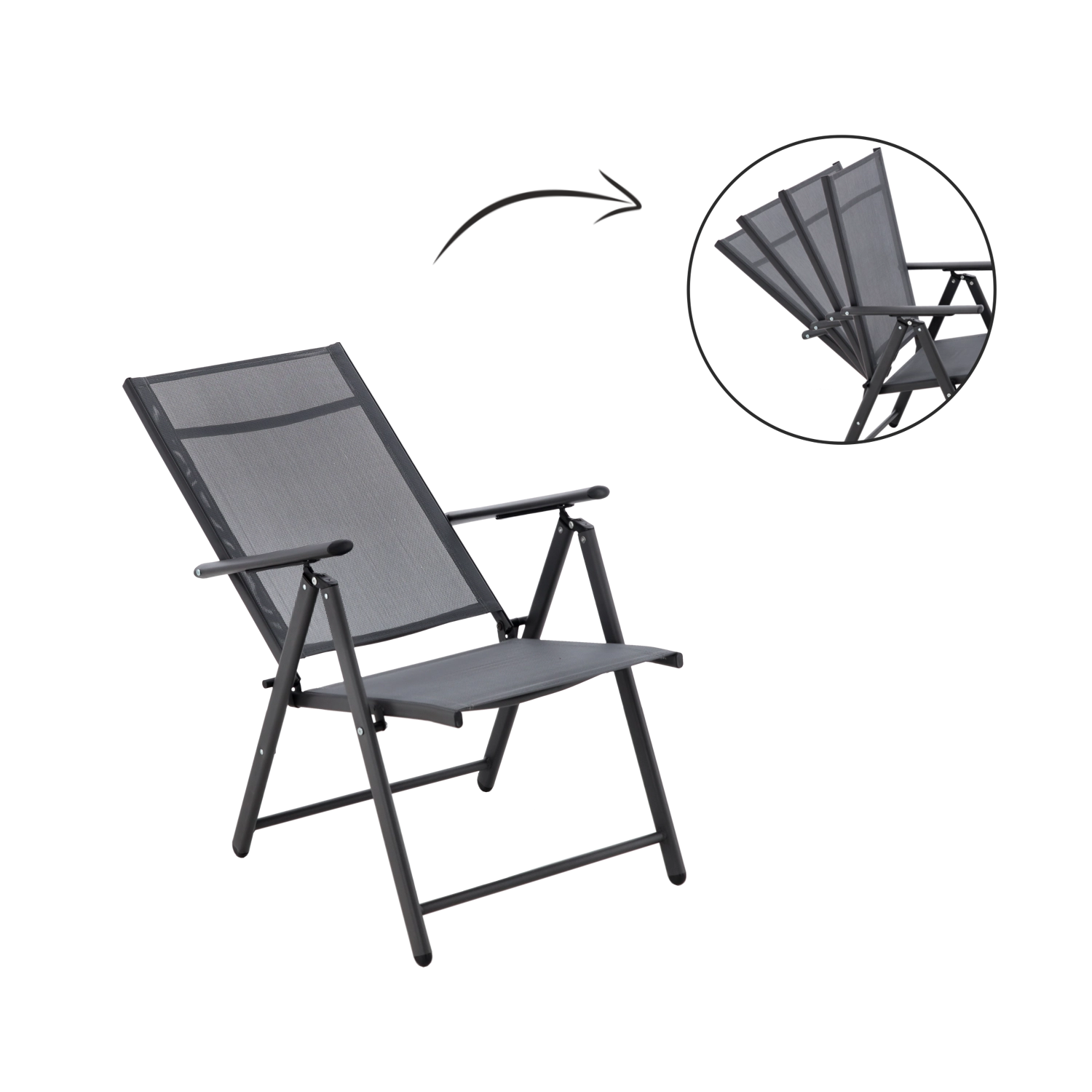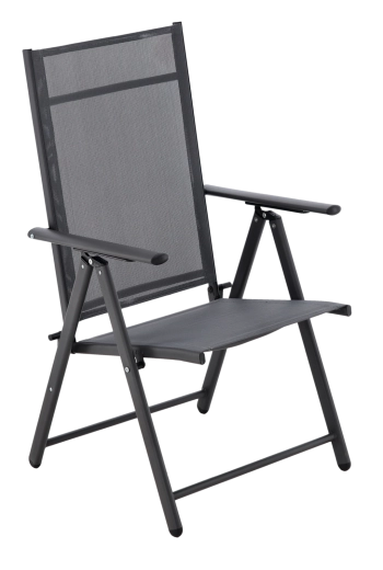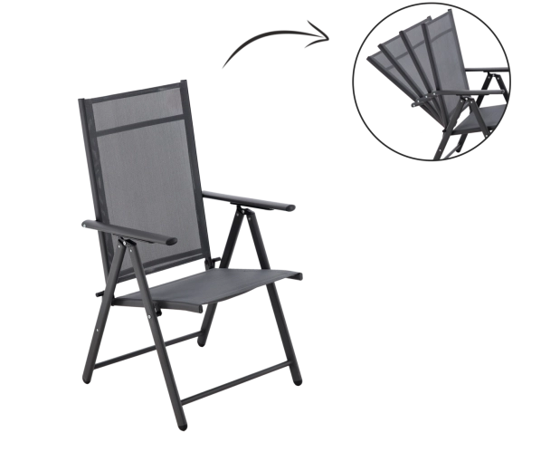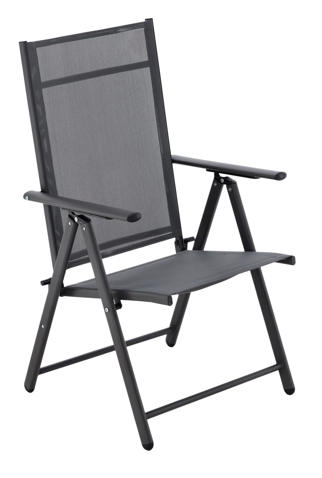 Pulverlakeret stål øger modstandsdygtigheden over for vejret og slid, mens de komfortable armlæn støtter en ergonomisk siddestilling. Foldemekanismen gør det let at opbevare og transportere til sommerhus eller camping.
