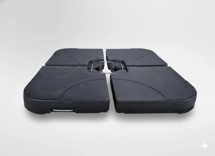 Hver af de fire dele fyldes med vand, hvilket markant øger den samlede vægt af basen. Tætte låg holder indholdet sikkert inde og parasollen stabilt på plads.