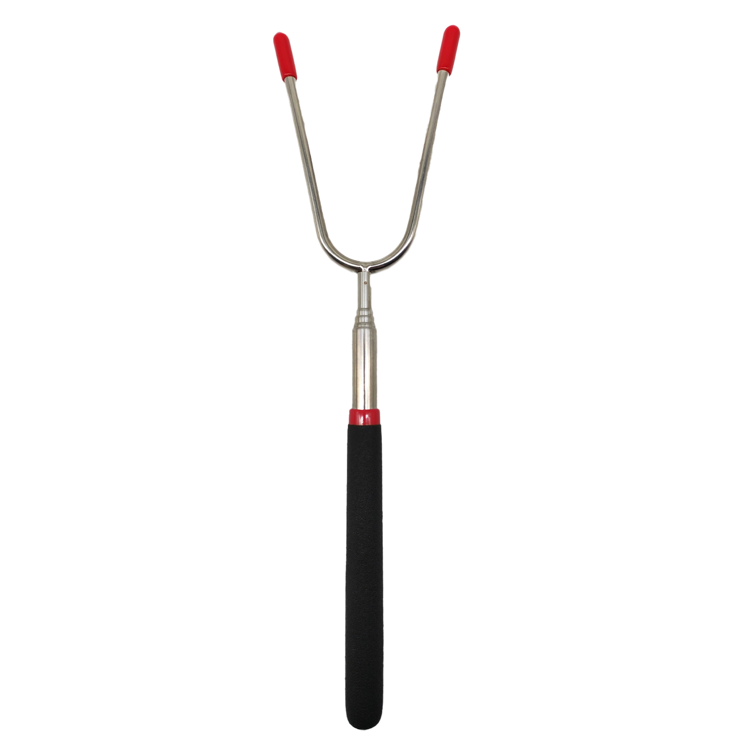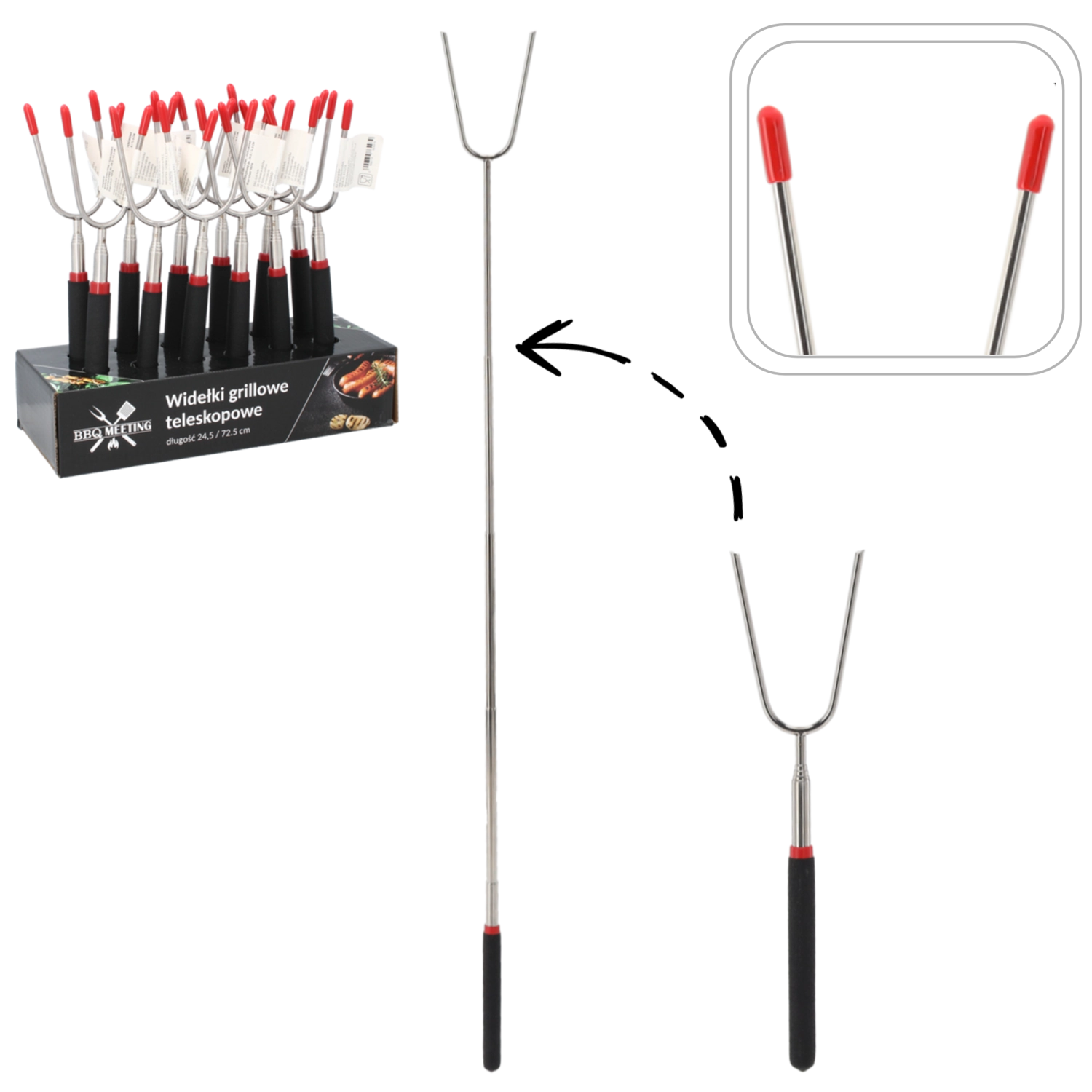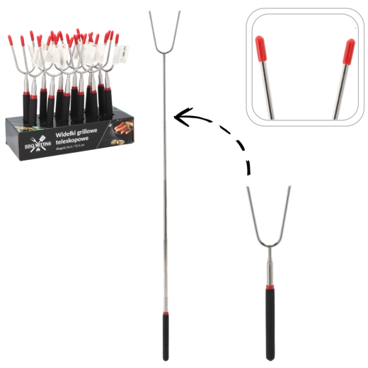 Praktiske teleskopiske spyd til nem ristning ved bål og på grill. Takket være den justerbare længde på 24,5–72,5 cm holder du en sikker afstand til flammerne, mens det to-tandede design sikkert fastholder pølser, skumfiduser eller grøntsager. Ideelle til camping, picnics og havegrill.
