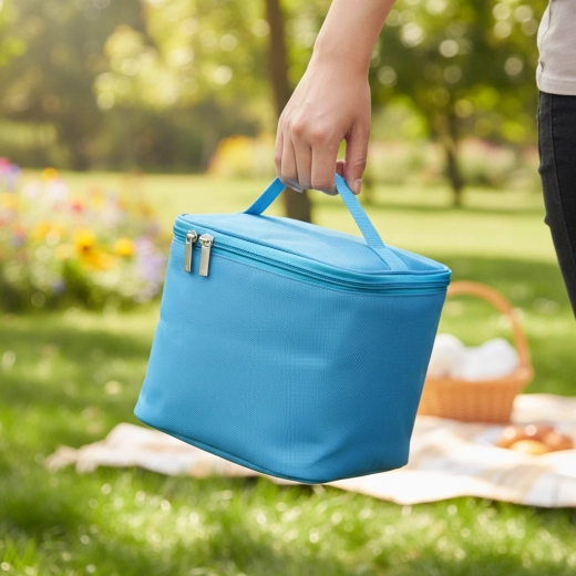 En kompakt og stilfuld termotaske med en kapacitet på 4 liter i elegant blå holder din frokost, snacks og drikkevarer friske længere. Takket være to medfølgende køleelementer og det slidstærke Oxford 600D-stof er den ideel til arbejde, skole, udflugter og picnics. Det praktiske øverste håndtag, den lette konstruktion og pålidelig lynlås med to skydere sikrer behagelig bæring og nem adgang til indholdet.