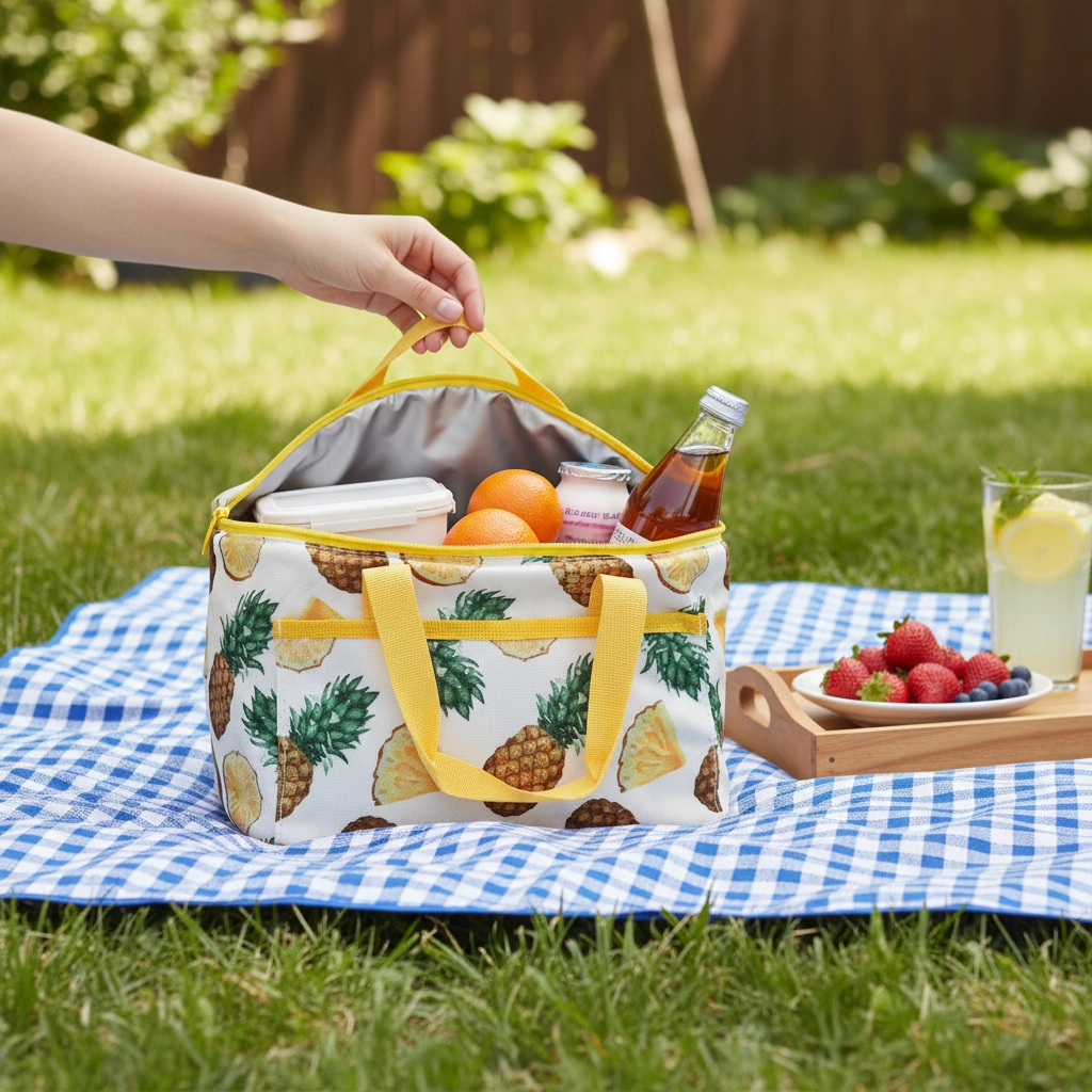 Nyd friske forfriskninger hvor som helst. Denne stilfulde isotermiske taske 6 l med attraktivt ananasprint kombinerer lav vægt, slidstærkt stof og fremragende isolering. De to medfølgende køleblokke forlænger køleeffekten på varme dage.