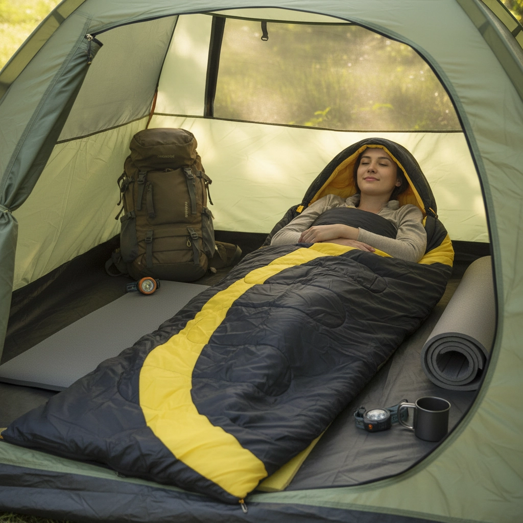 Med en vægt på ca. 0,85 kg og medfølgende pose kan soveposen nemt pakkes til lille volumen – ideel til camping, festivaler og weekendture.