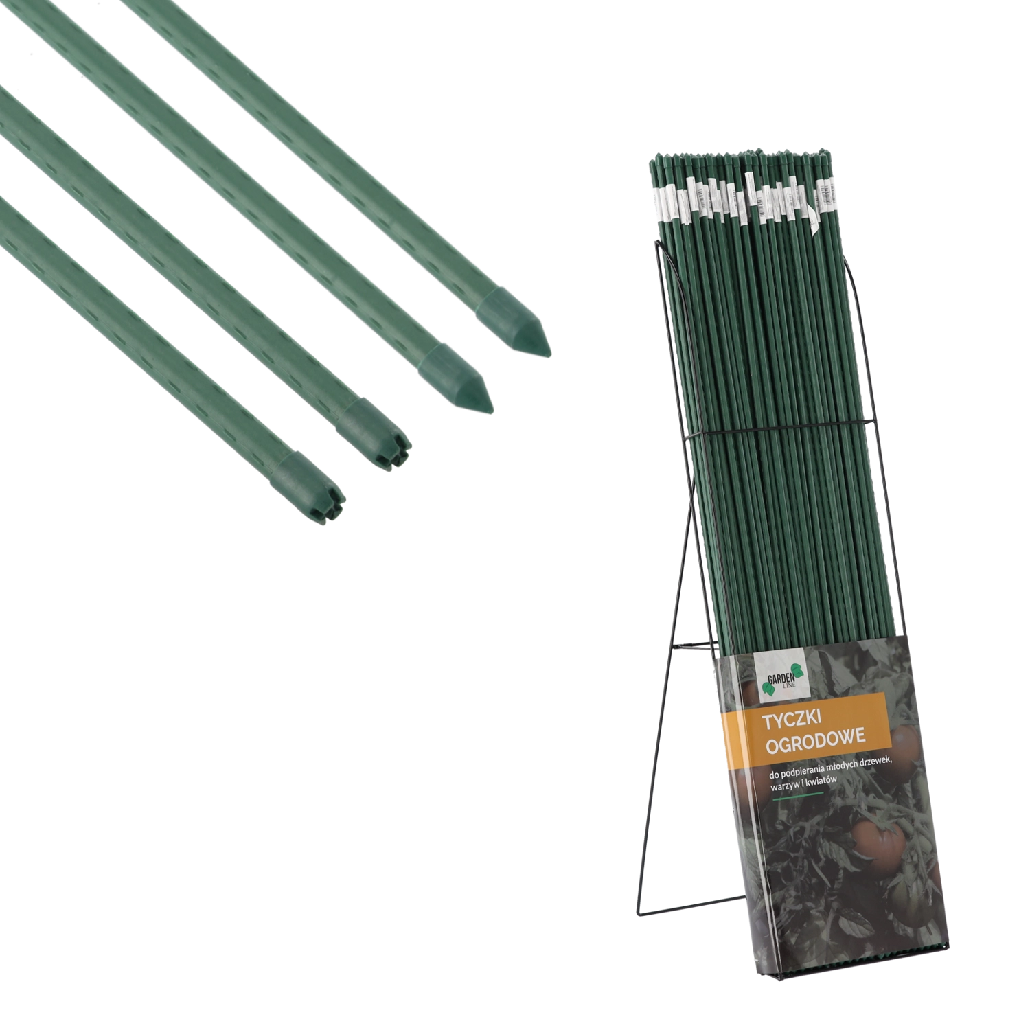 Installationen er enkel: placer stangen i jorden ved siden af planten og bind forsigtigt stammen til den – du får stabil støtte og beskyttelse mod brud selv i blæsende vejr. Pakken indeholder desuden et stålstativ for endnu fastere fastgørelse og organiseret opstilling af støtter i bedet.