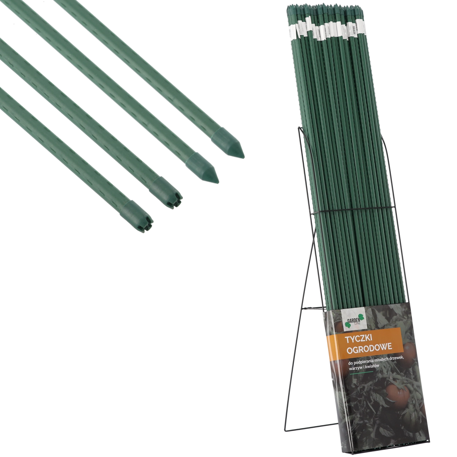 En praktisk støtte til have, drivhus og bede, som sikkert leder klatreplanter, grøntsager og unge træer. Takket være metalkernen og overfladen af polyethylen er pinden stærk, holdbar og korrosionsbestandig. Den spidse spids gør det lettere at stikke den i jorden, og de fine ribber forhindrer, at plantestrips glider.
