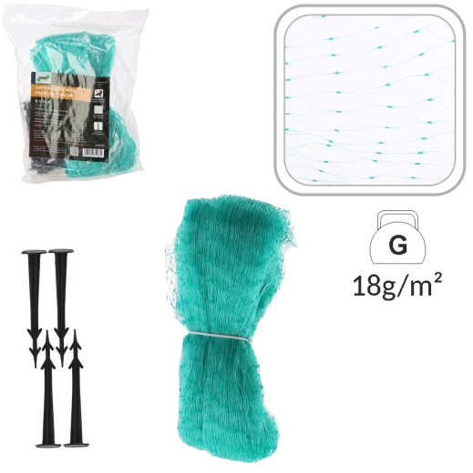 Let og holdbart beskyttelsesnet mod fugle af polypropylen beskytter effektivt udbyttet på træer og buske. Takket være den grønne farve er det diskret i haven, det tynde og fleksible net tilpasser sig let trækroner og belaster ikke grenene. Ideelt til kirsebær, surkirsebær, stikkelsbær, blåbær, jordbær samt vin. Vejrbestandigt, egnet til gentagen brug. Inkluderer 16 pløkker til fastgørelse.