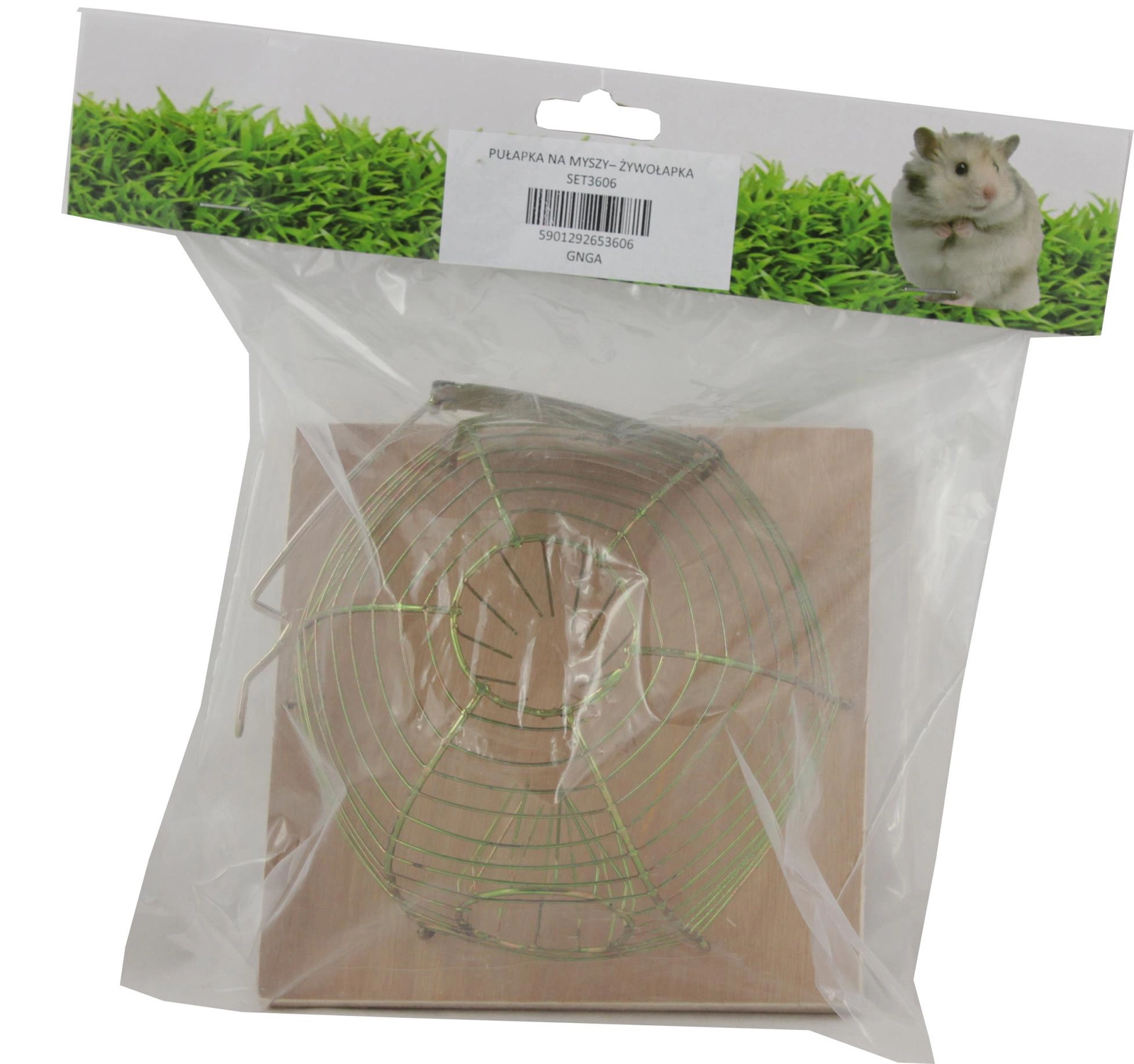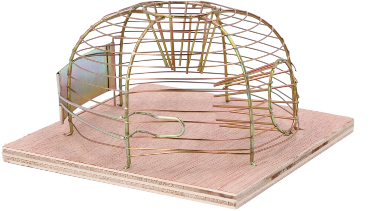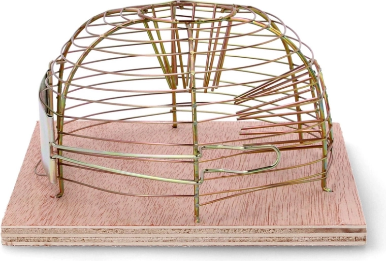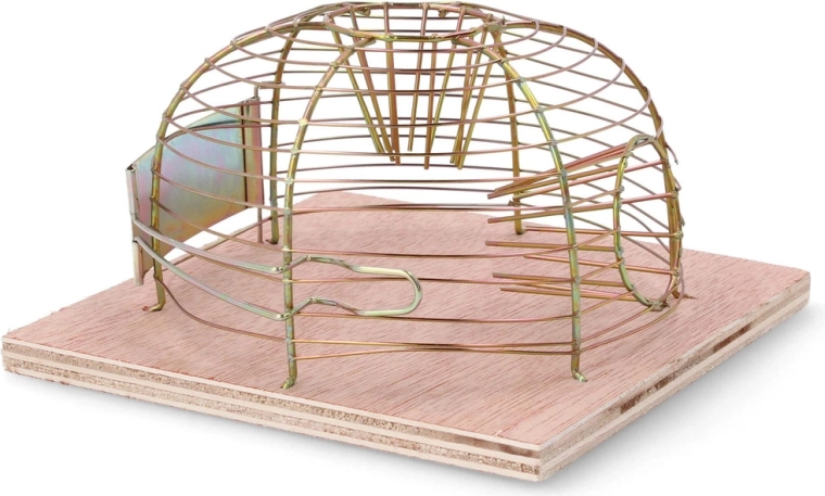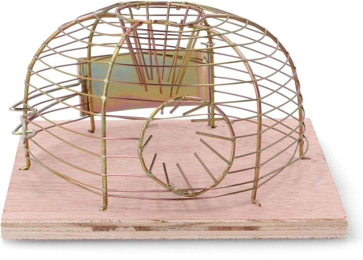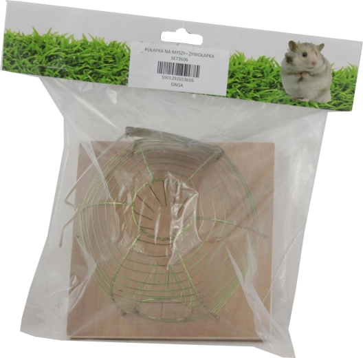 Denne levende-fangst fælde muliggør sikker indfangning af mus og efterfølgende udsætning i passende afstand. Den åbne trådkuppel giver godt udsyn og ventilation, mens træfundamentet giver stabilitet på plane overflader.