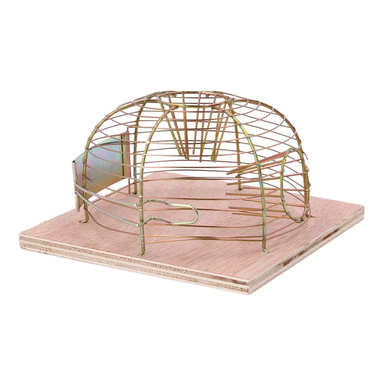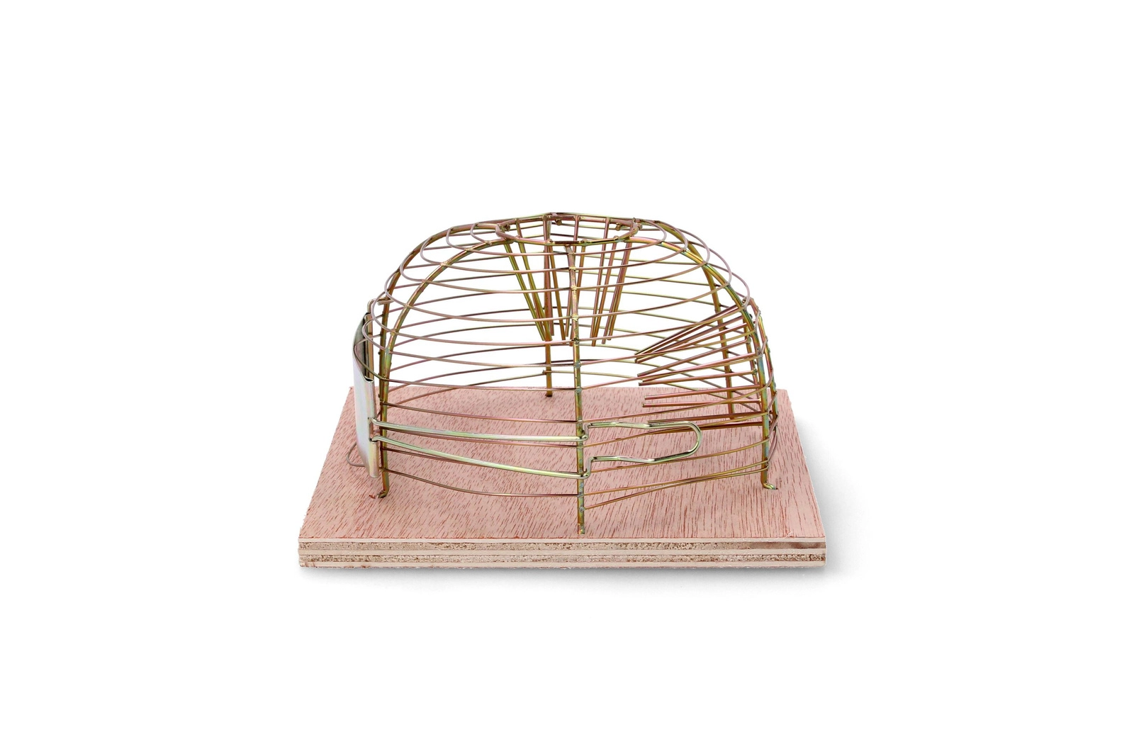 Den gyldent-tonede metalkurv giver holdbarhed og fremragende ventilation, mens træfundamentet holder fælden stabilt på plads.