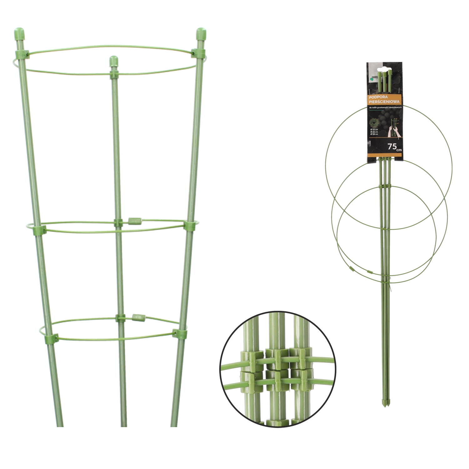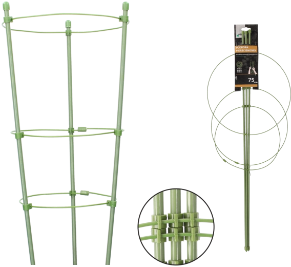 Denne praktiske støtte med tre ringe er ideel til hortensia, blåbær samt højere stauder og prydplanter. Stålkonstruktionen med polyethylenbelægning giver lang levetid og pålidelig støtte selv i blæsevejr. Den grønne overflade forstyrrer ikke udseendet af bedet eller krukken.