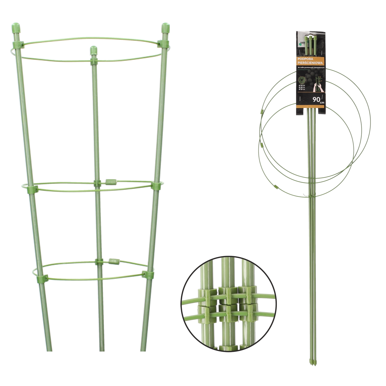 Denne runde støtte med tre ringe forhindrer, at stængler lægger sig ned, og fremmer en jævn, harmonisk vækst. Den robuste metalkonstruktion med polyethylenbelægning er meget vejrbestandig og modstandsdygtig over for mekanisk slid, så den egner sig til helårsbrug i haven såvel som indendørs.