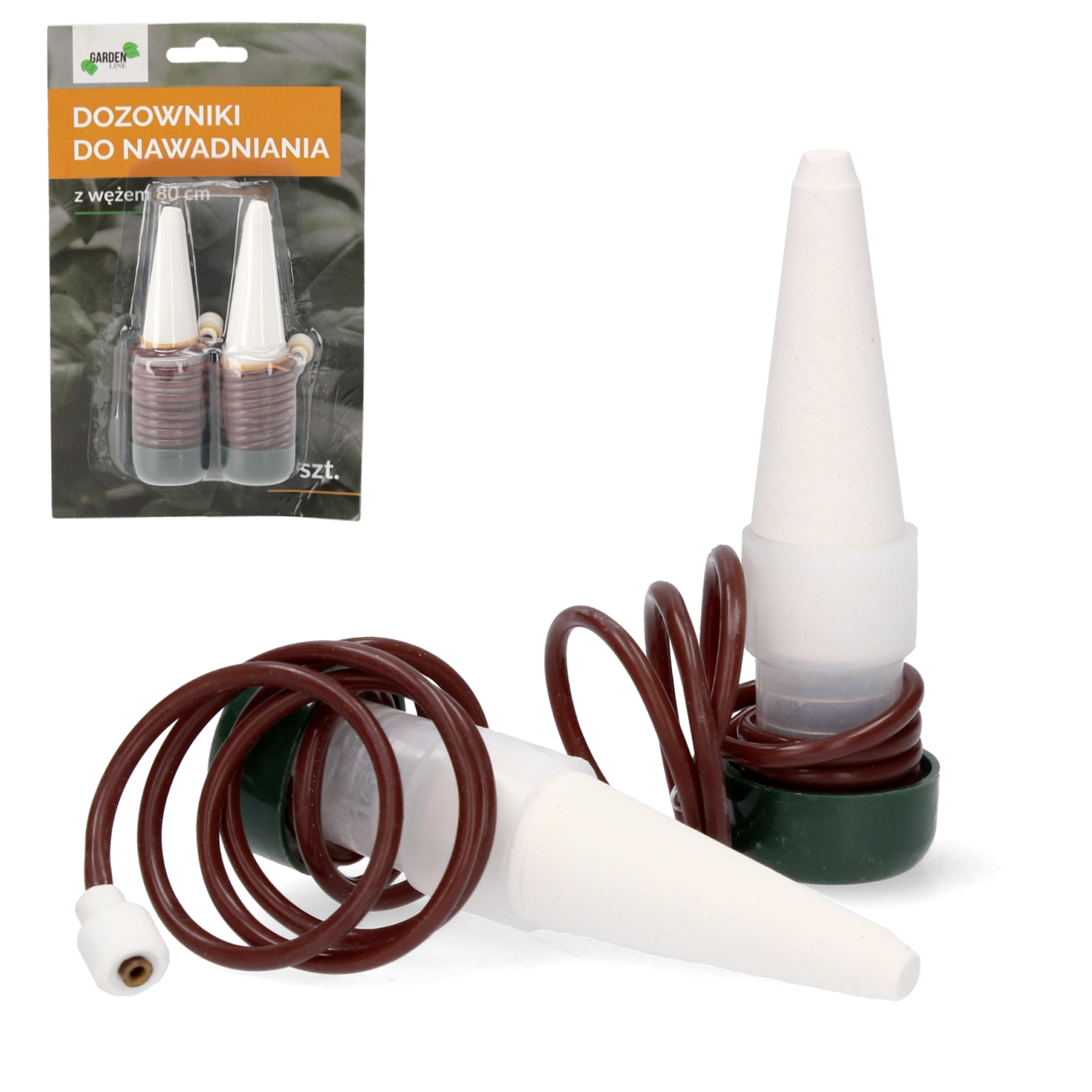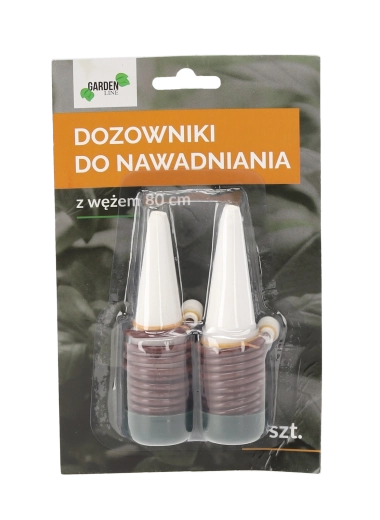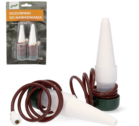 Praktisk sæt til bekymringsfri plantepleje: 2 automatiske vandingsdosere med 80 cm slange holder jorden optimalt fugtig, selv når du er væk. Nemt at installere, pålidelig vandforsyning til stue-, altan- og drivhusplanter.