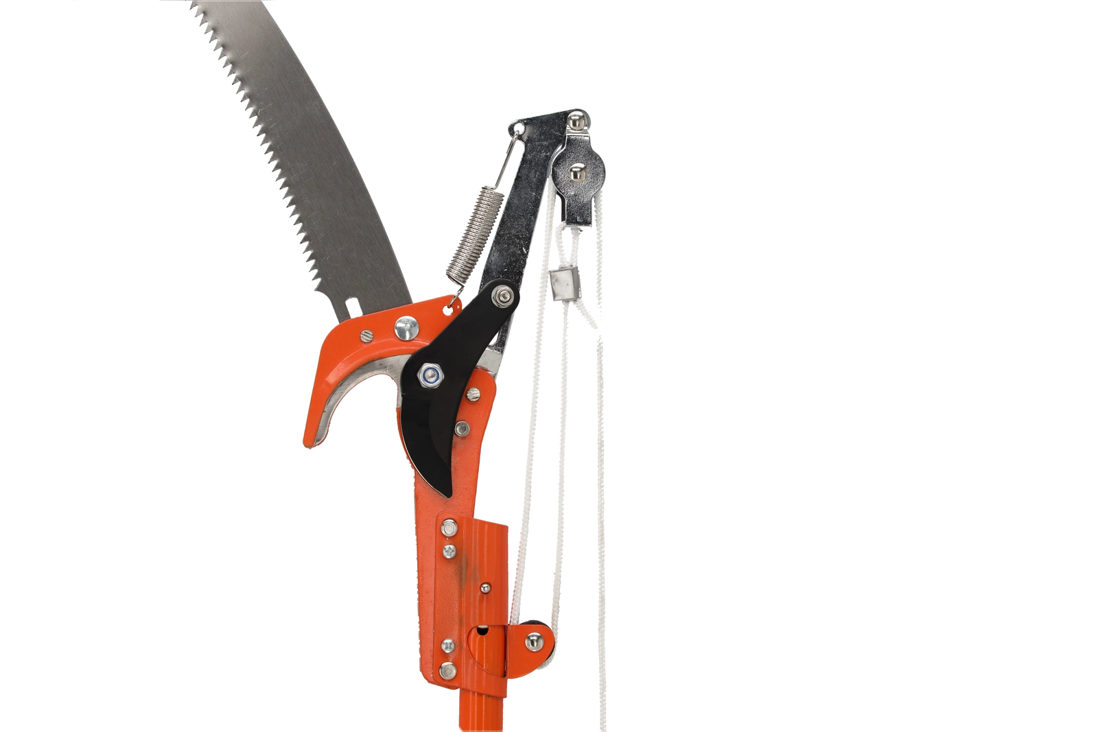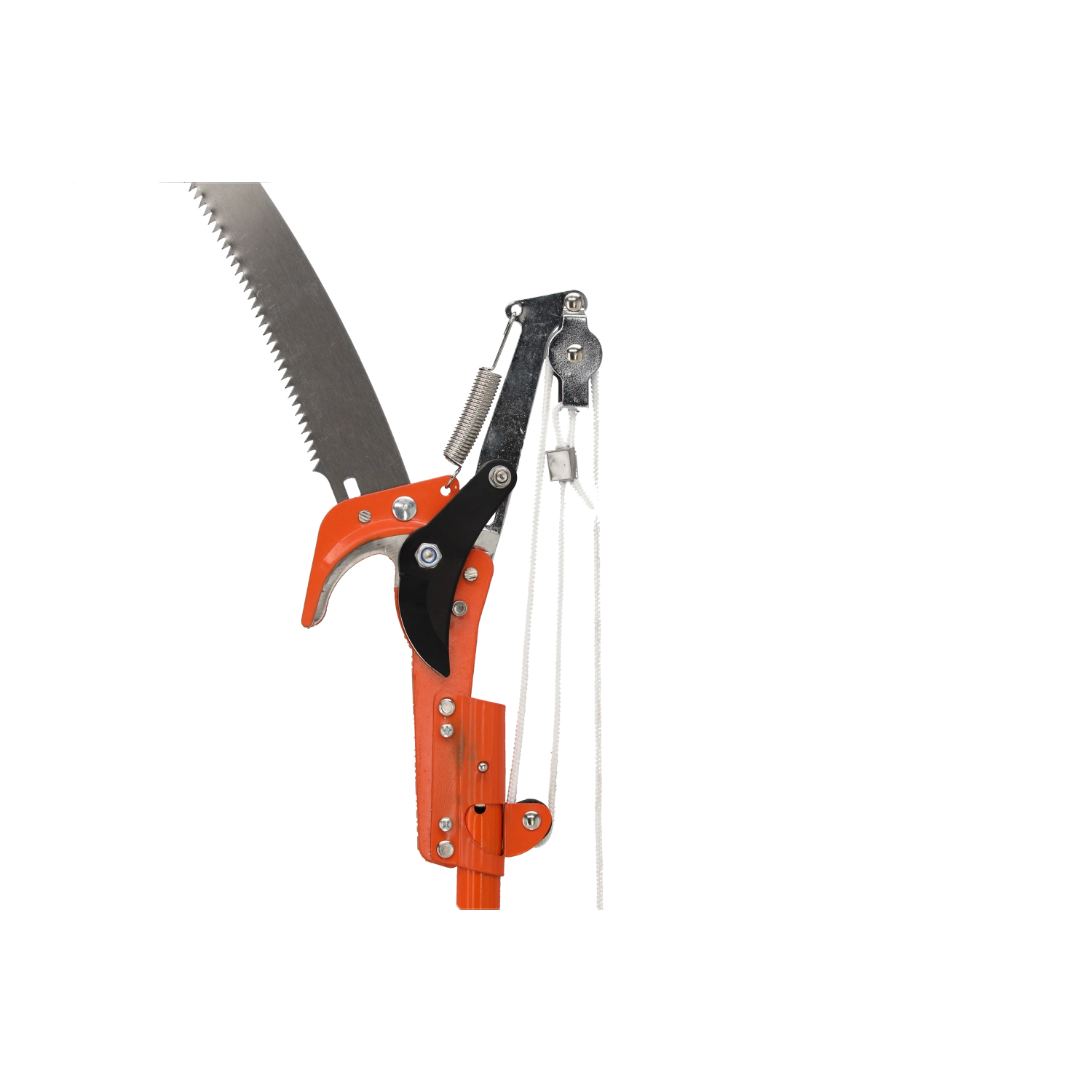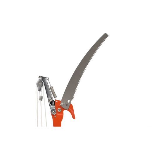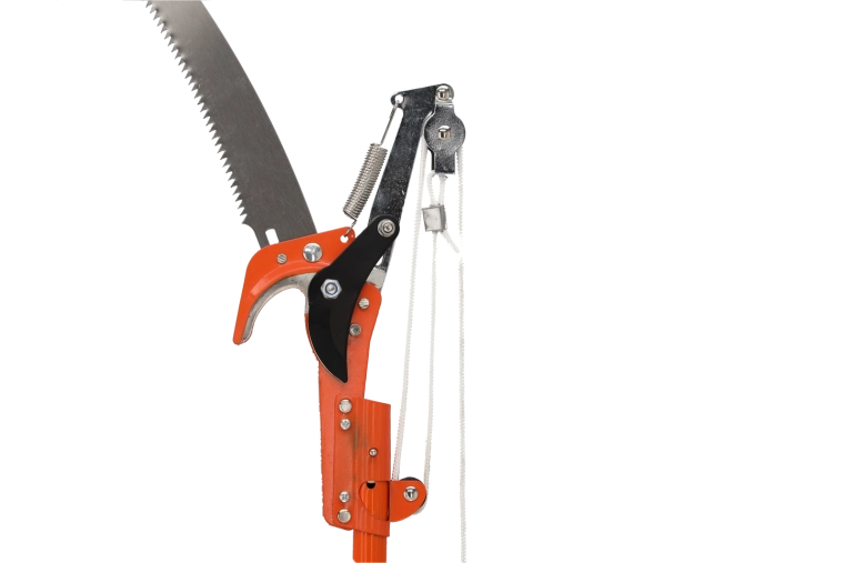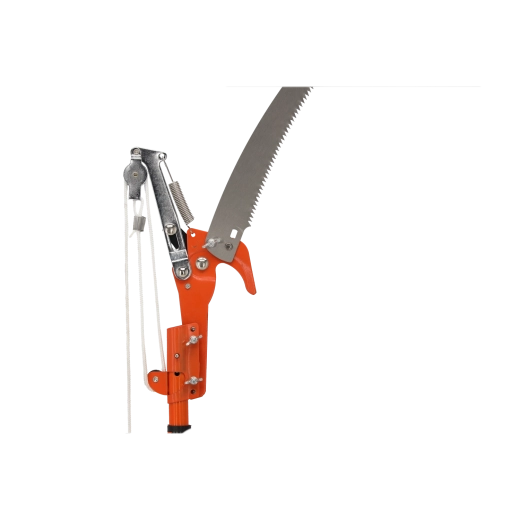 Bypass-grænsakse med løftestangs-/rebsystem til rene snit og en aftagelig buet sav til tykkere grene for alsidigt arbejde i træerne.