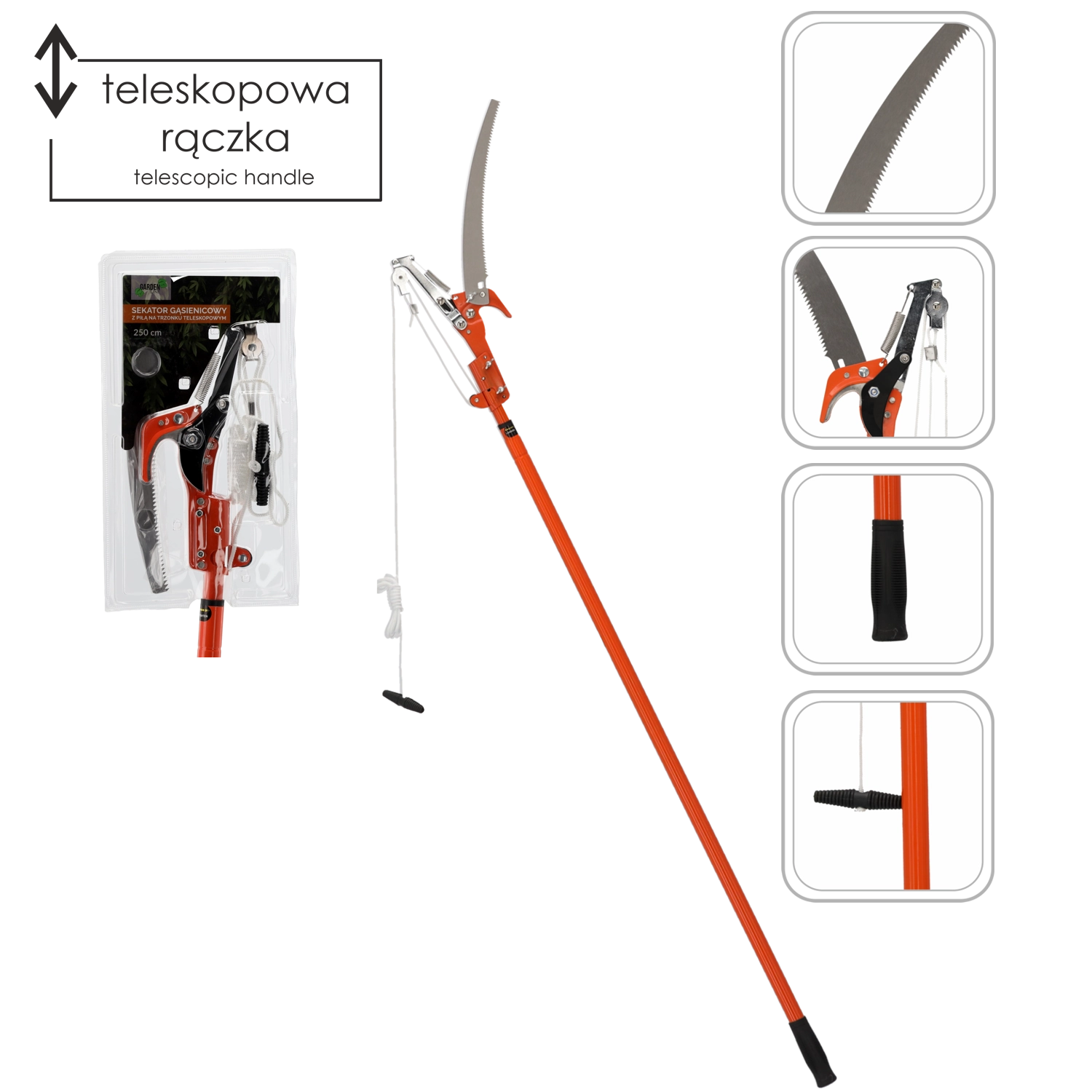 Denne alsidige beskærer kombinerer fordelene ved bypass-grænsakse med løftestangs-/rebsystem og en buet håndsav. Værktøjet leverer rene snit i tyndere grene og effektive snit i tykkere grene med saven – alt sammen fra jorden. En teleskopstang på op til 250 cm sikrer komfortabel rækkevidde uden at skulle klatre.