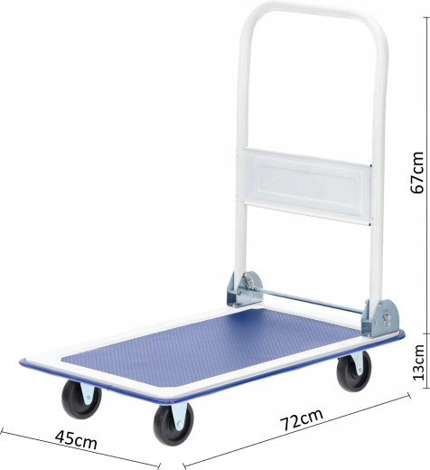 Praktisk platformvogn med en belastningskapacitet på 150 kg og kompakte mål 72 × 45 × 80 cm, som gør det nemt at transportere pakker, kasser og materialer i hjemmet, på kontoret og på lageret. Takket være det sammenklappelige håndtag og 4 drejelige hjul er den let at manøvrere og fylder minimalt efter brug. Den robuste konstruktion og skridsikker overflade sikrer sikker og stabil drift.