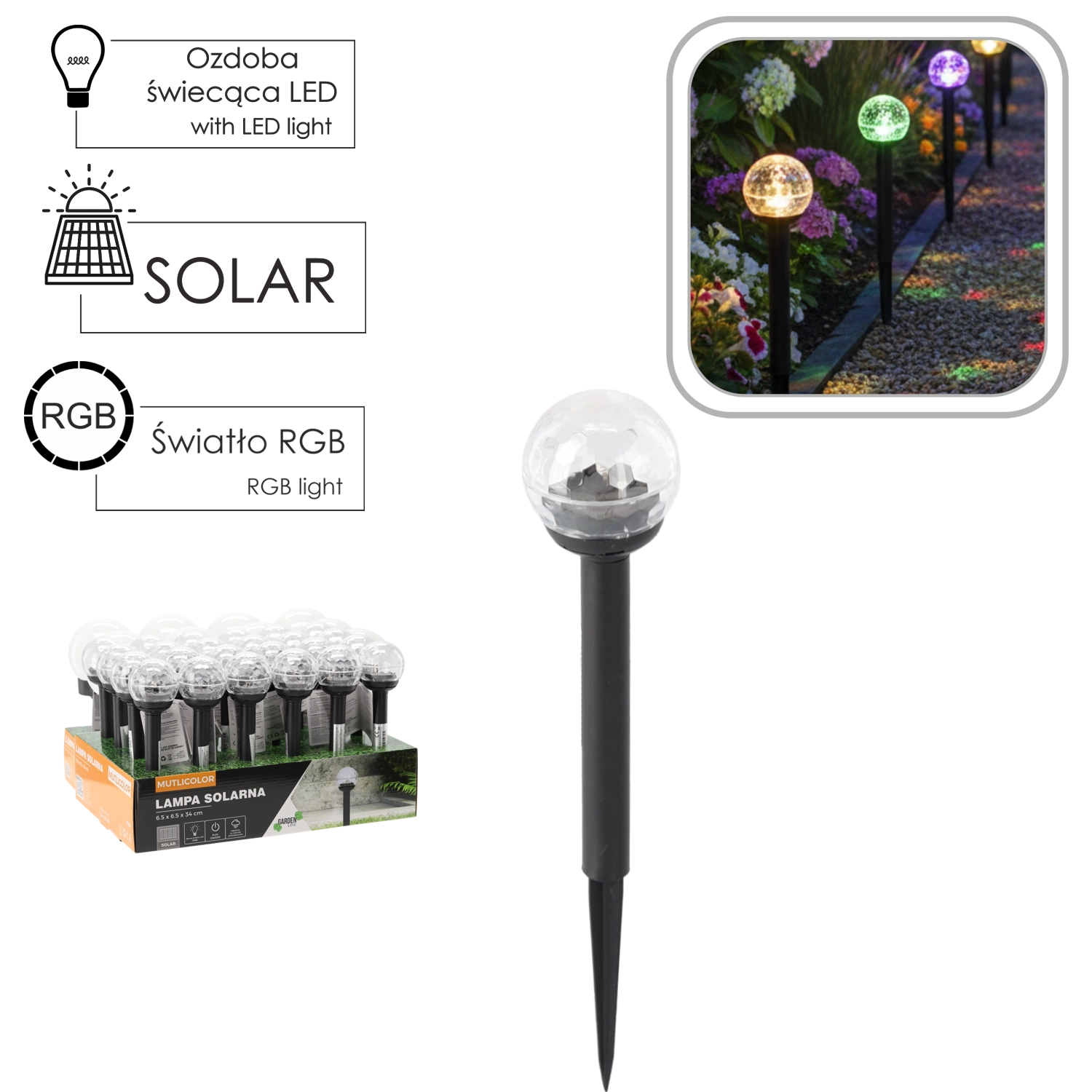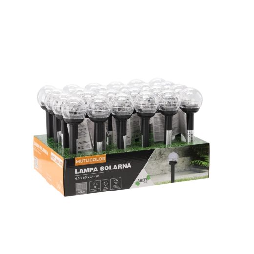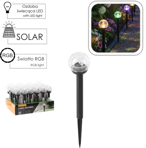 Stilfuld solcelledrevet LED-lampe til haven med multicolor RGB-effekt giver behagelig belysning uden kabler og energiomkostninger. Takket være solpanelet oplades den om dagen og tænder automatisk om aftenen. IP44-beskyttelse og jordspyd sikrer nem installation og drift ved stier, terrasser eller omkring bede.