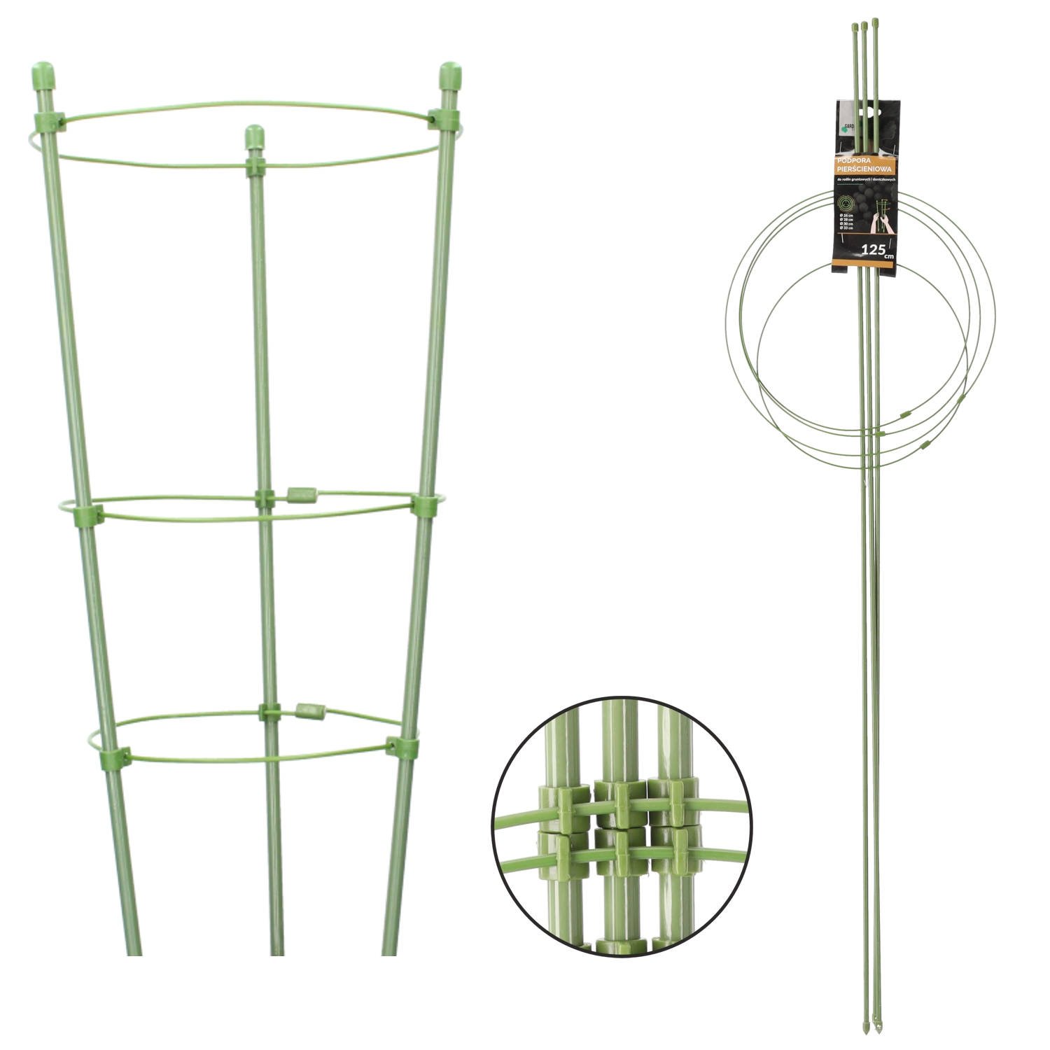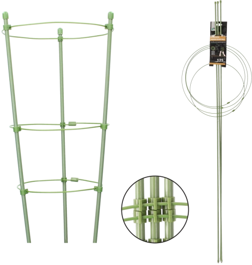 Praktisk rund plante-støtte med en højde på 125 cm, som giver dine blomster og buske pålidelig stabilitet og harmonisk vækst. Den robuste stålkonstruktion med PE-belægning tåler fugt og vind, mens den grønne farve diskret går i ét med beplantningen. Ideel til både bede og krukker – et fremragende alternativ til enkeltpinde.