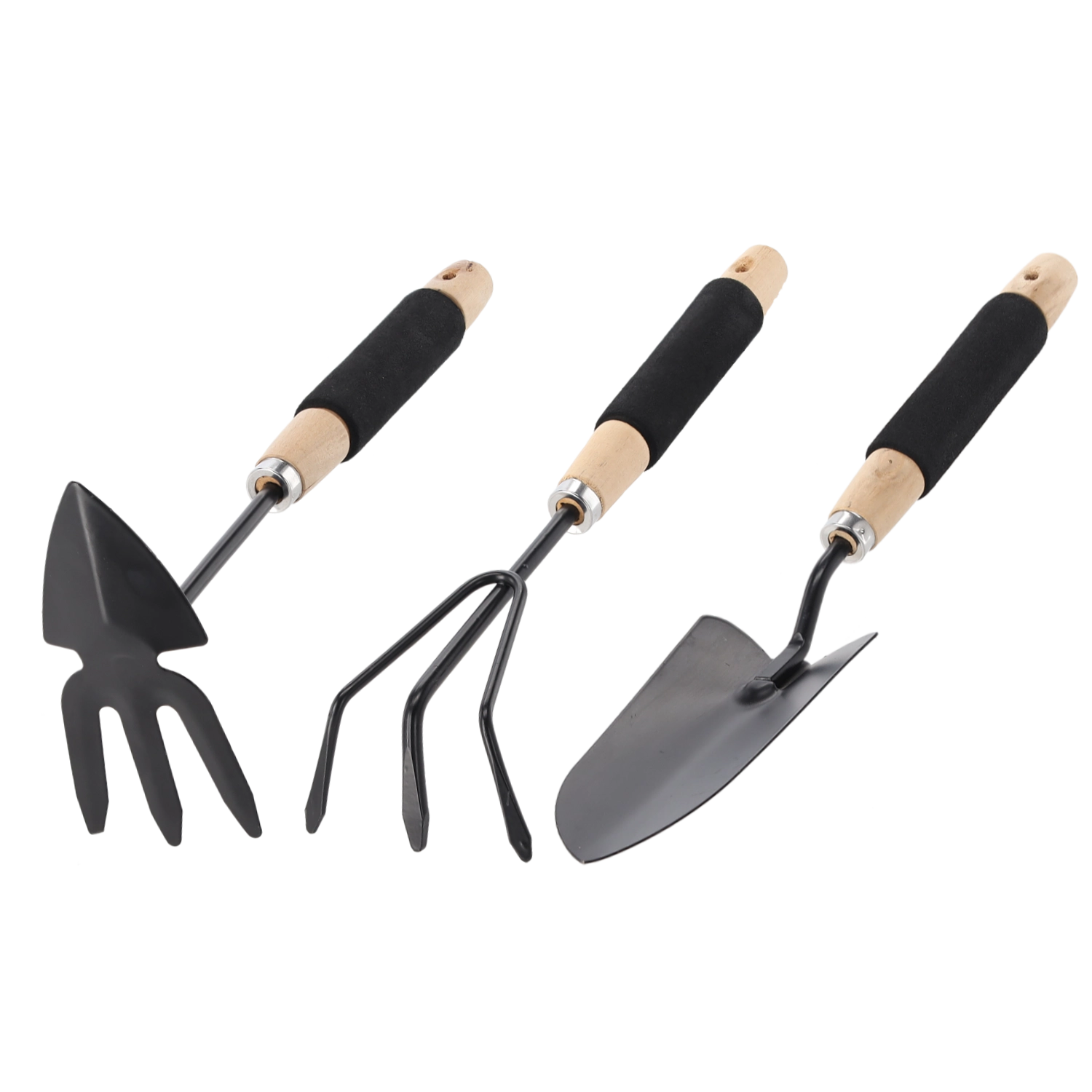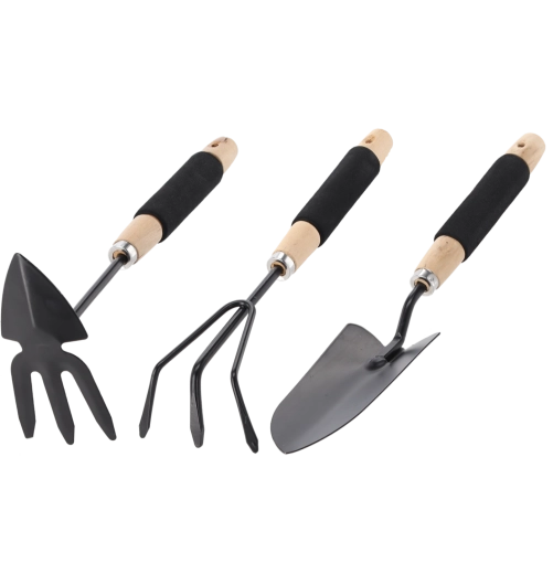 Praktisk sæt med tre håndredskaber til daglig pleje af bede, potter og altankasser. Indeholder en skovl, en havegaffel og en hakke/kultivator med holdbare metalhoveder og ergonomiske træhåndtag med blødt greb. Til præcis plantning, løsning af jord og lugning med maksimal komfort og lang levetid.