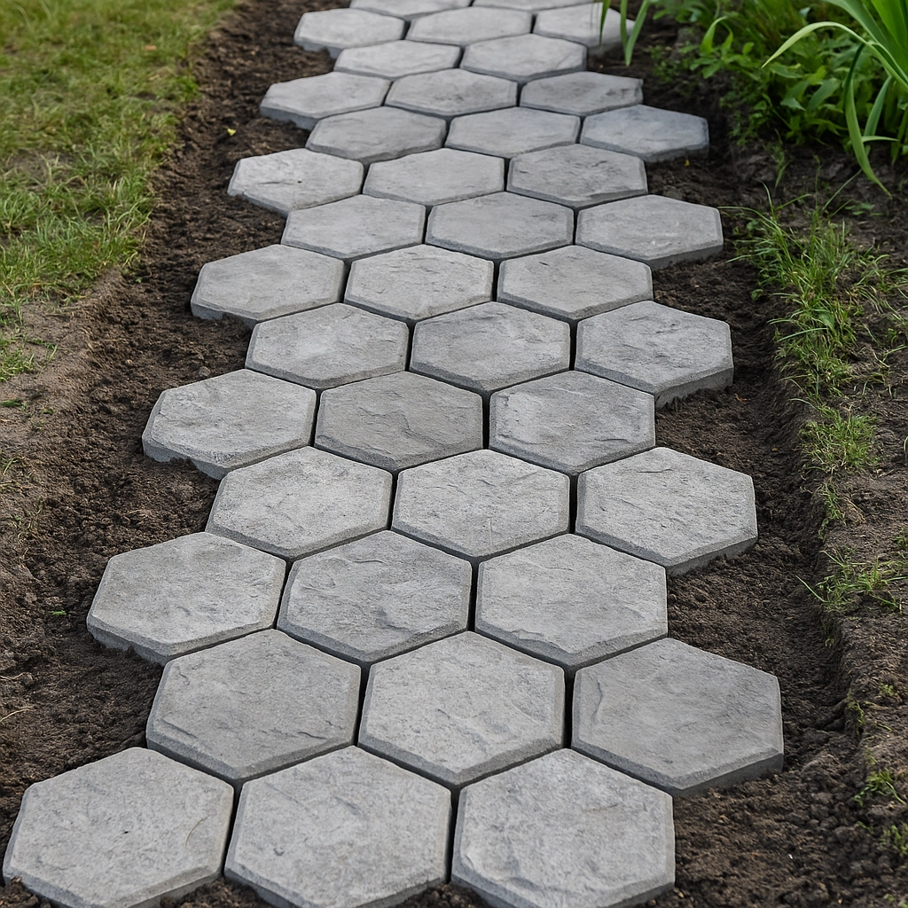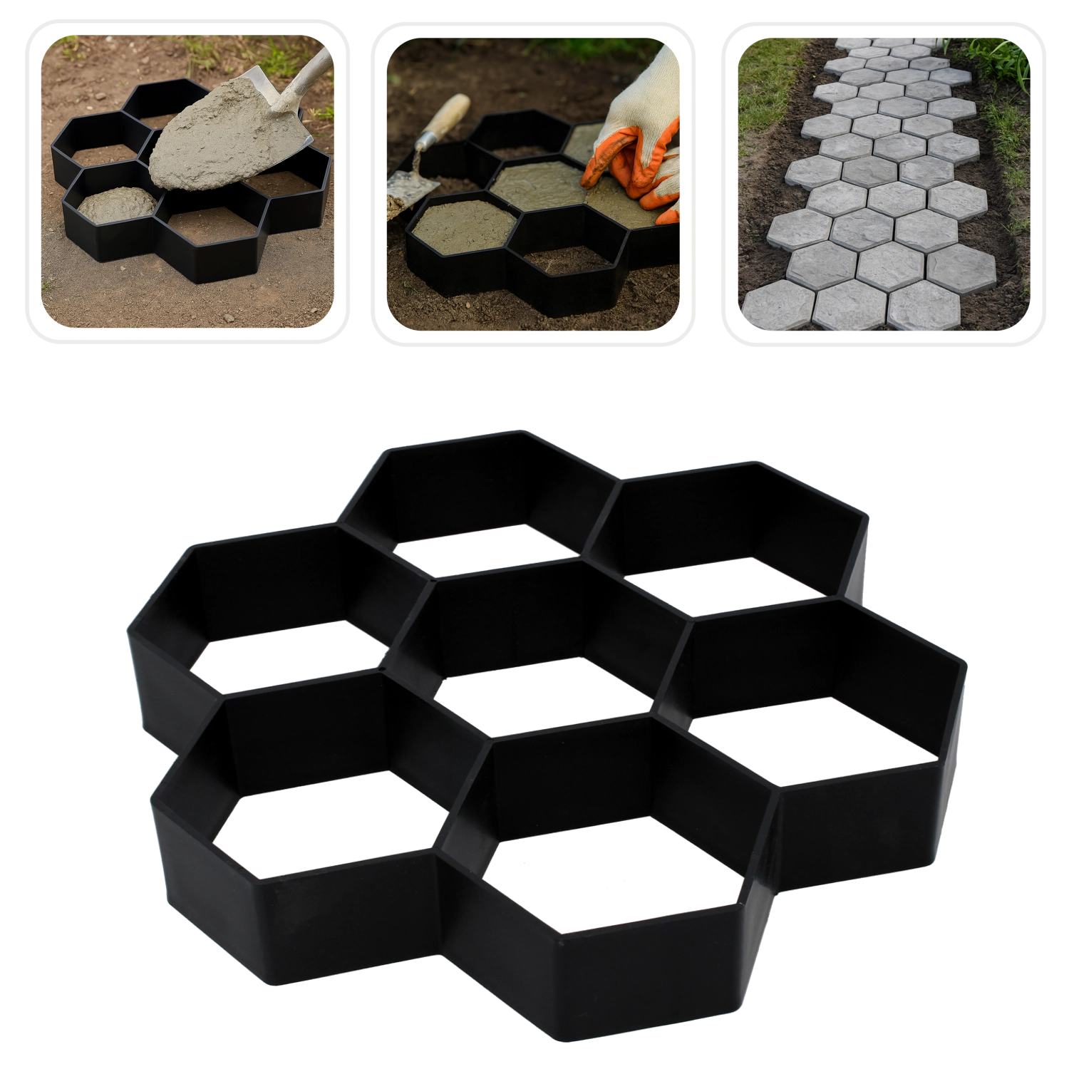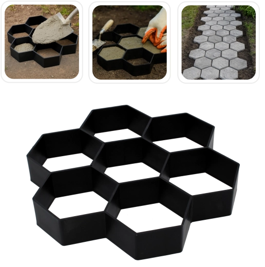 Formen er klar til hurtig og ren betonstøbning. Læg den på underlaget, fyld med blandingen, glit og løft den af, når betonen har sat sig en smule – formen kan nemt gentages og sammensættes i forskellige mønstre. Takket være de universelle mål 29 × 29 × 4 cm designer du let en sti, der passer præcist til pladsen og havens stil.