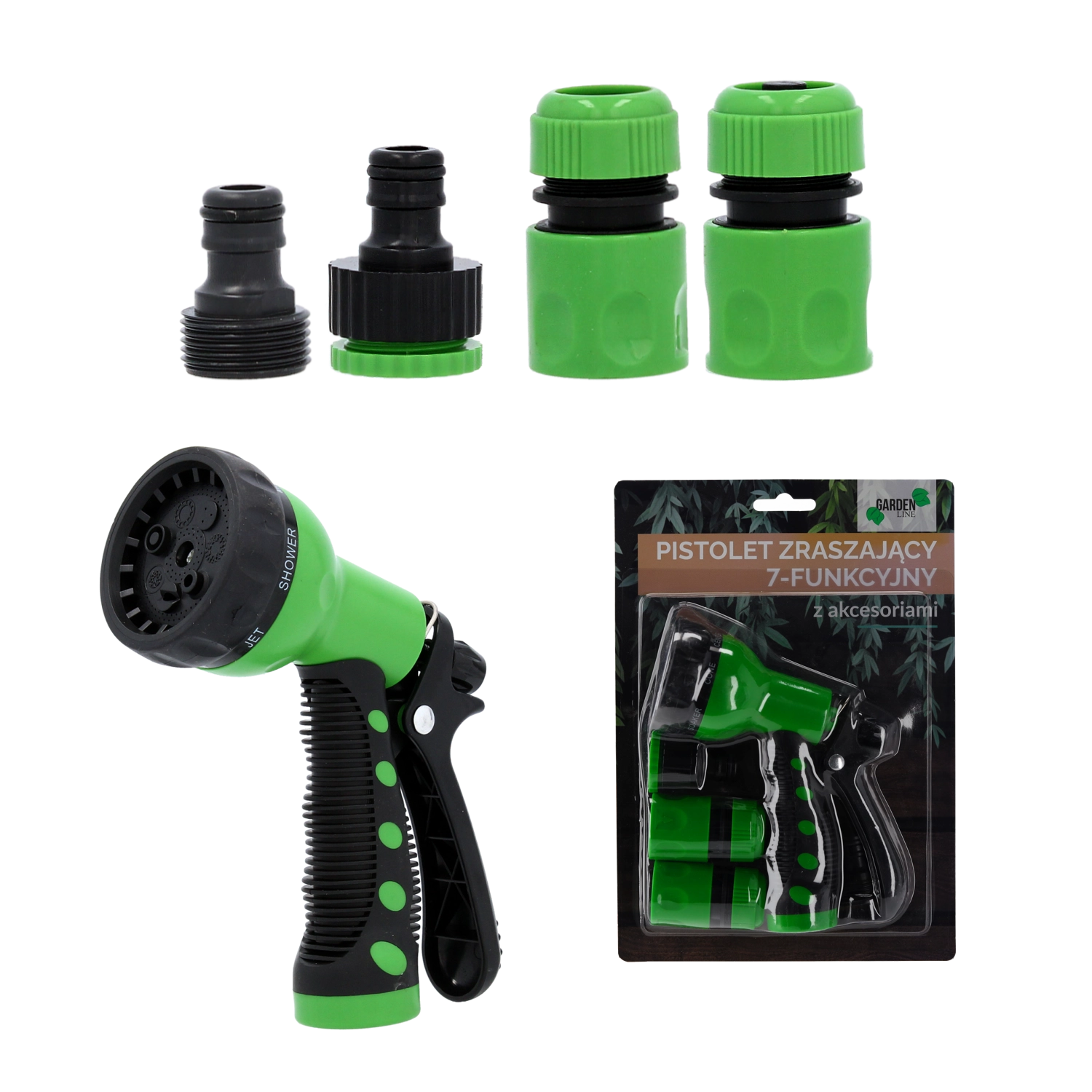 Universal haveforstøver med 7 spraytilstande til vanding og rengøring. Den ergonomiske aftrækker muliggør trinløs regulering af gennemstrømningen, og den lette, holdbare ABS/TPR-konstruktion er UV- og frostbestandig. Sættet inkluderer hurtigkoblinger 1/2" og en haneadapter 1/2"–3/4" til hurtig, lækagefri tilslutning.
