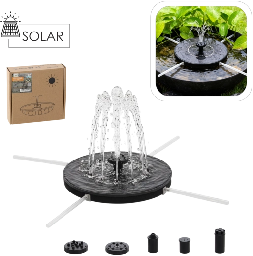 I pakken finder du flere dysemundstykker til forskellige former for vandeffekter. Springvandet er et fremragende valg til solrige steder uden adgang til stikkontakt – på terrasser, ved damme eller i fuglebade.