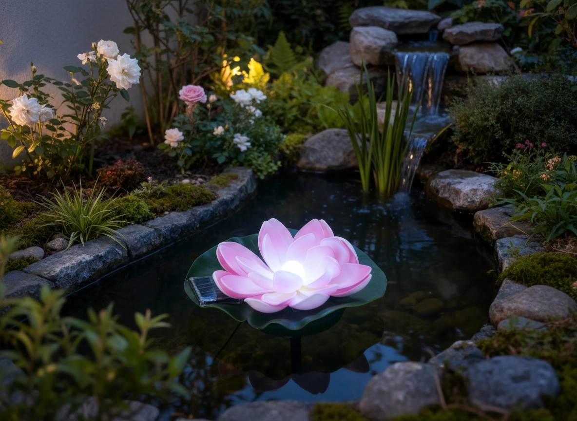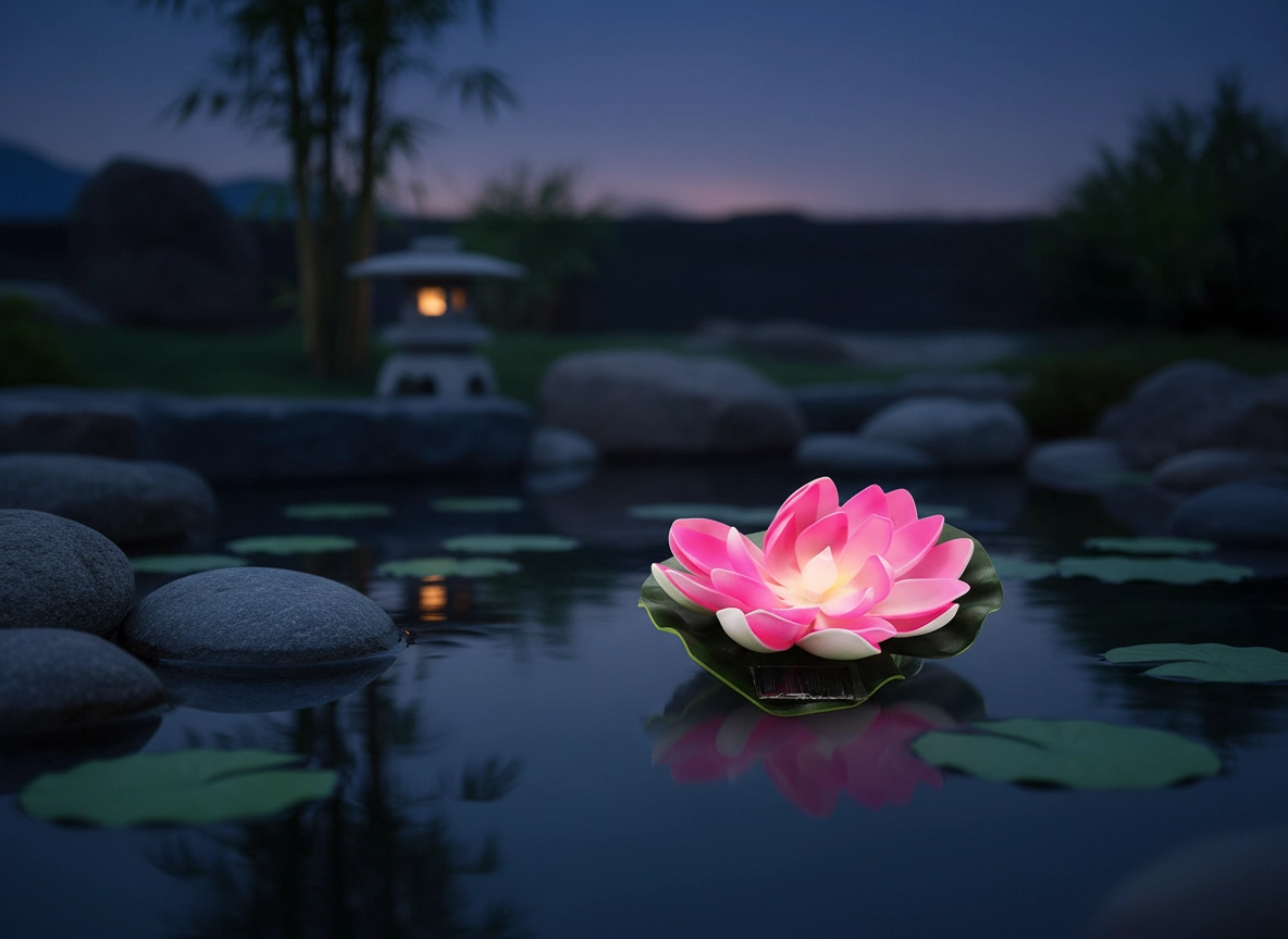 Designet med realistiske kronblade og et grønt blad giver naturligt udseende og stabil flydning på vandoverfladen. Den trådløse, miljøvenlige løsning uden behov for vedligeholdelse er et perfekt valg til havedamme, små vandspejle og dekorative beholdere med vand.