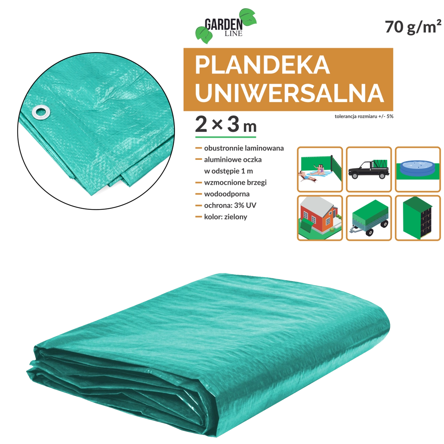 Universel grøn presenning i størrelsen 2 × 3 m, der beskytter mod vejr, støv og fugt. Den er let (70 g/m²), dobbeltsidet lamineret, har UV-beskyttelse 3 %, metaløjer til fastgørelse og forstærkede kanter med snor for længere holdbarhed.